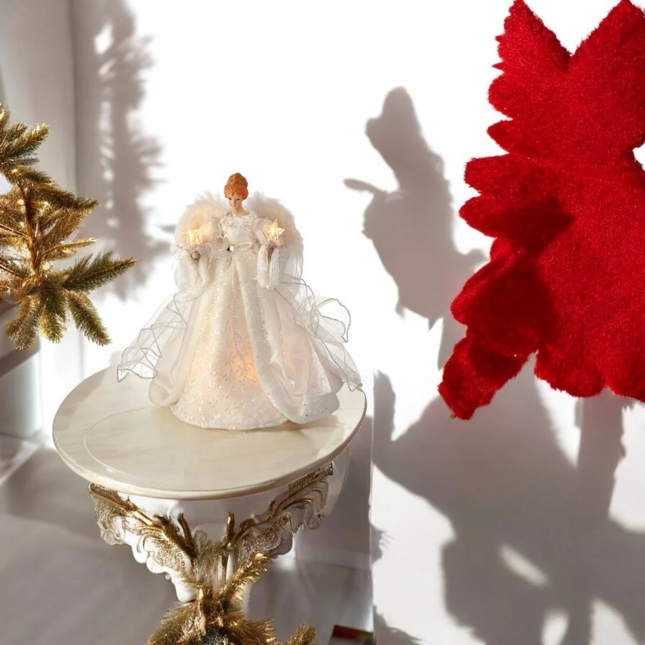 The intricate detailing, from her feathered wings to the delicate embroidery, adds a touch of sophistication and grace. Perfect for topping your Christmas tree or as a standalone piece, this angel will bring a heavenly presence to your celebrations.