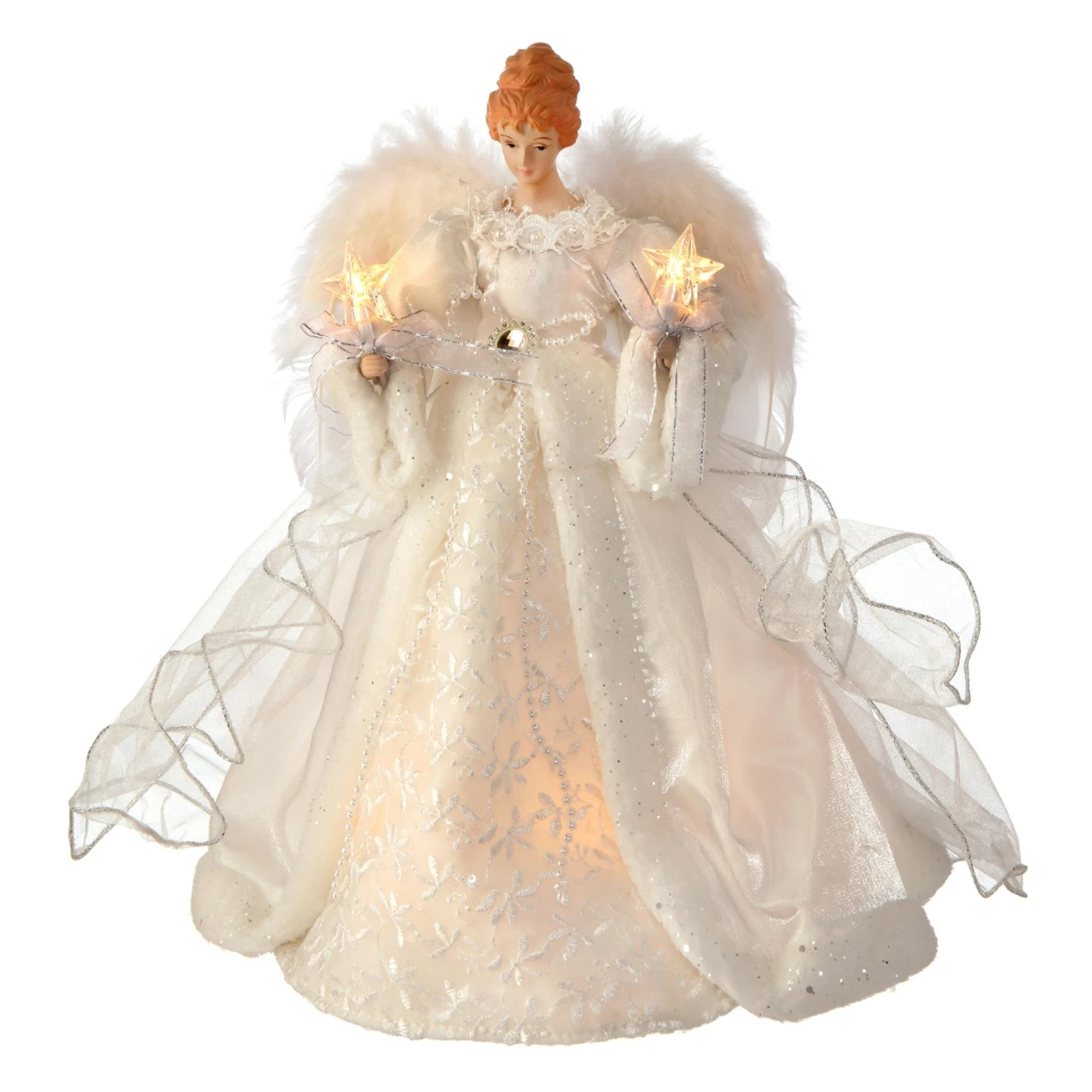 Illuminate your holiday decor with this enchanting 14″ UL 10 Lite White Silver Angel Tree Topper. This elegant angel is dressed in a flowing white gown adorned with silver accents, holding two lighted stars that cast a warm, ethereal glow.