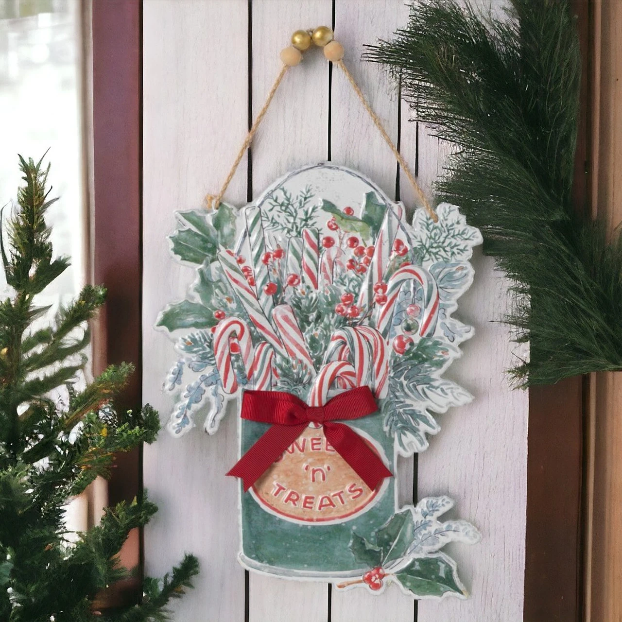 Adorned with a festive burlap bow and sprightly pine accents, it’s the jolly touch every nook craves during the holidays. Lively candy canes and cheerful berries peek out, promising to sprinkle your space with the magic of Christmas.
