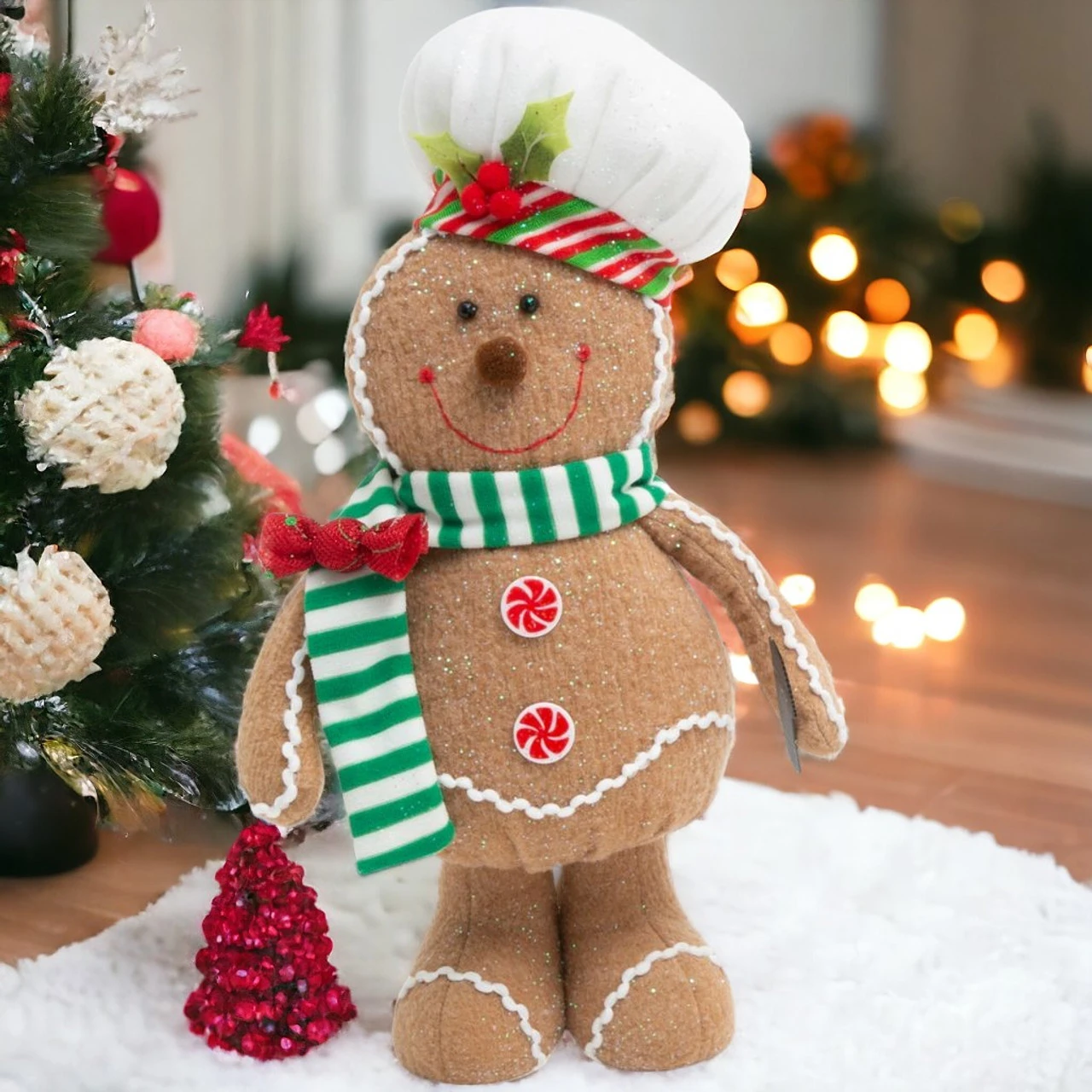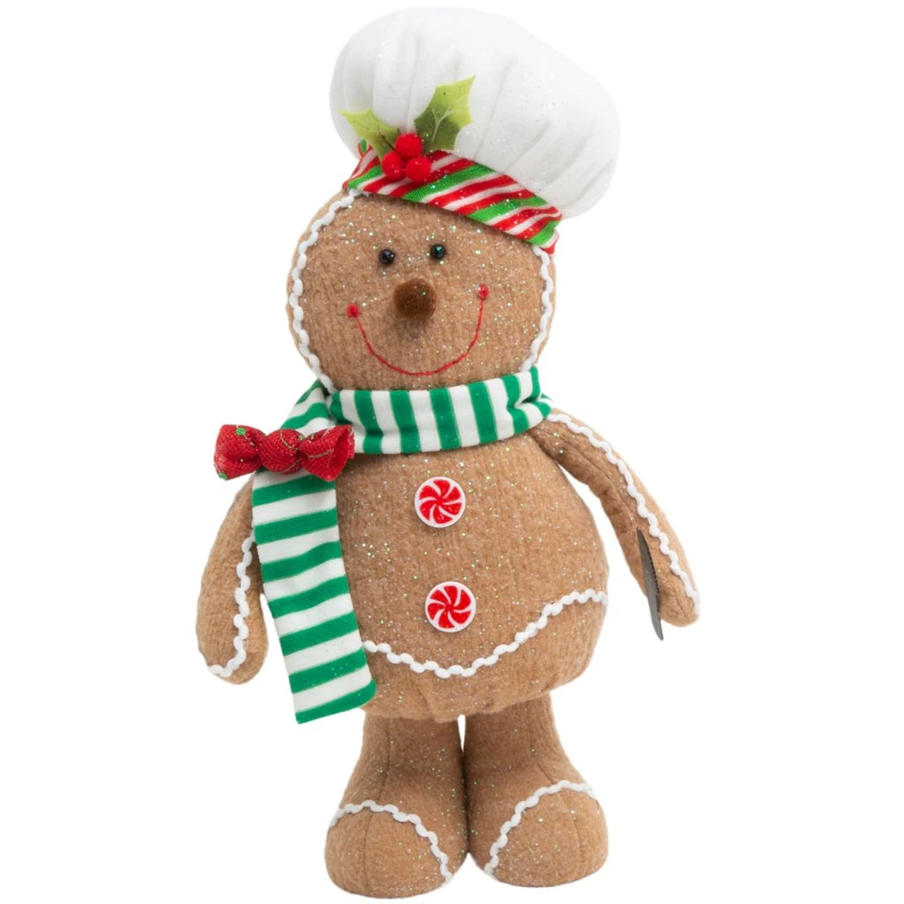 Whip up some holiday spirit with this adorable 15 Inch gingerbread man plush, sporting a chef’s hat! His sparkly eyes and a sweet, stitched smile, matched with a striped scarf and holly-adorned hat, are ready to charm.