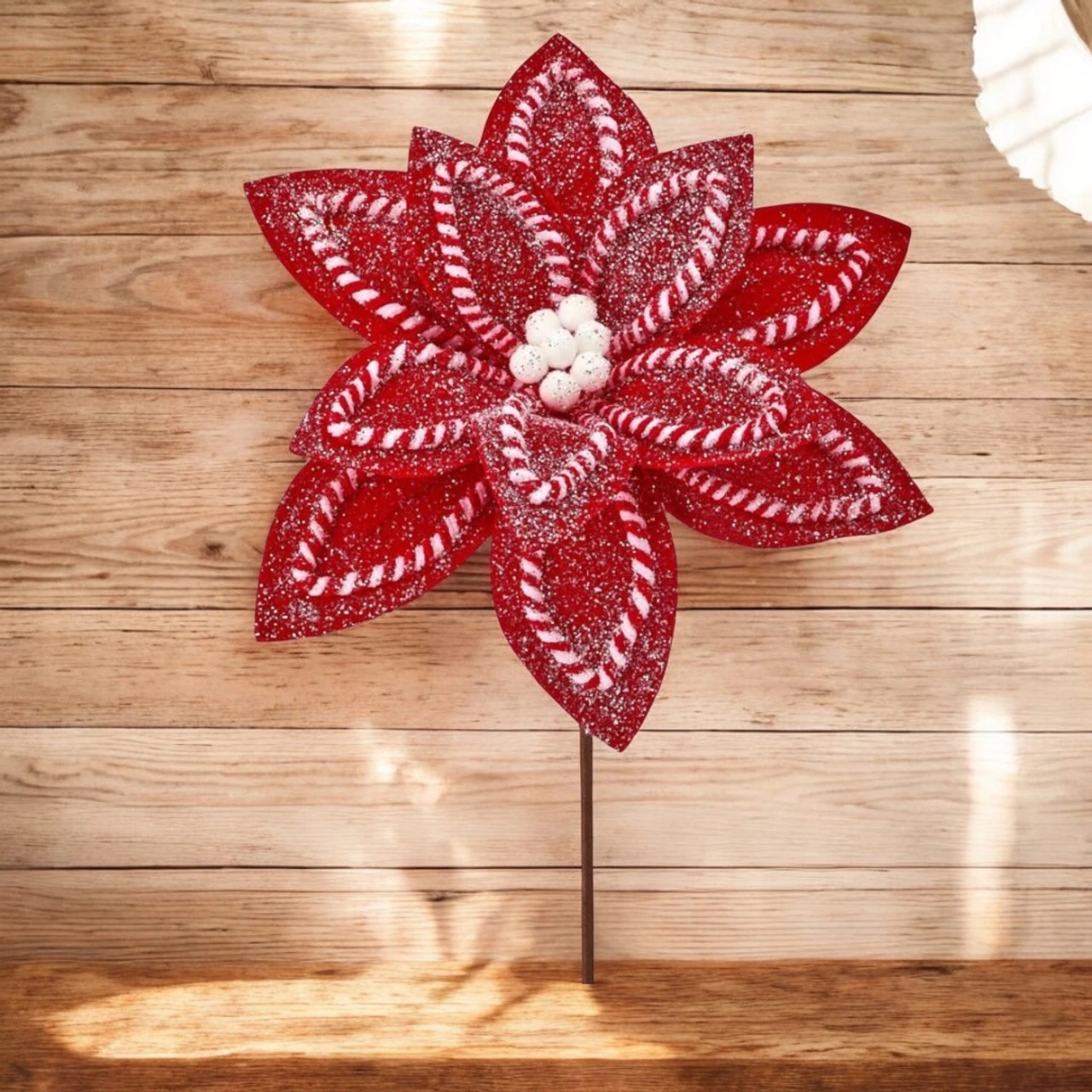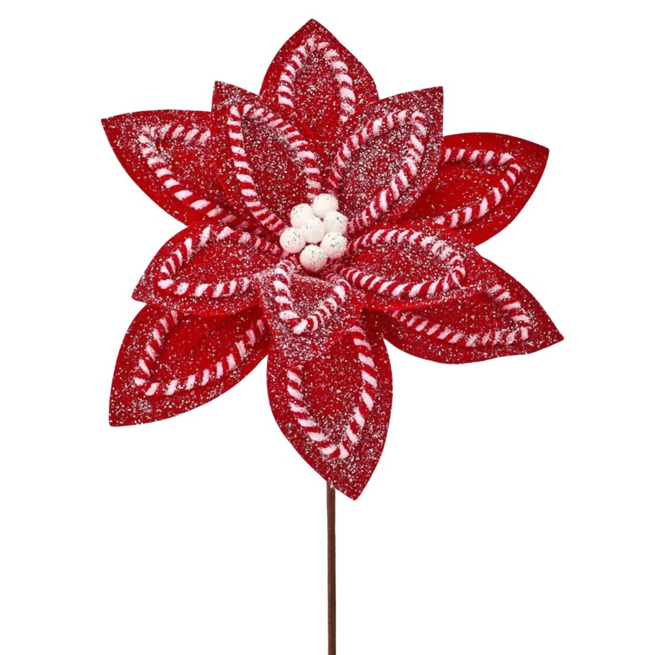 Add a sweet and festive touch to your holiday decor with this 22 Inch Sugar & Spice Poinsettia Stem. Designed to resemble a candy-coated poinsettia, this eye-catching floral pick features red petals trimmed with peppermint-inspired details and a sprinkle of glitter for extra holiday sparkle.