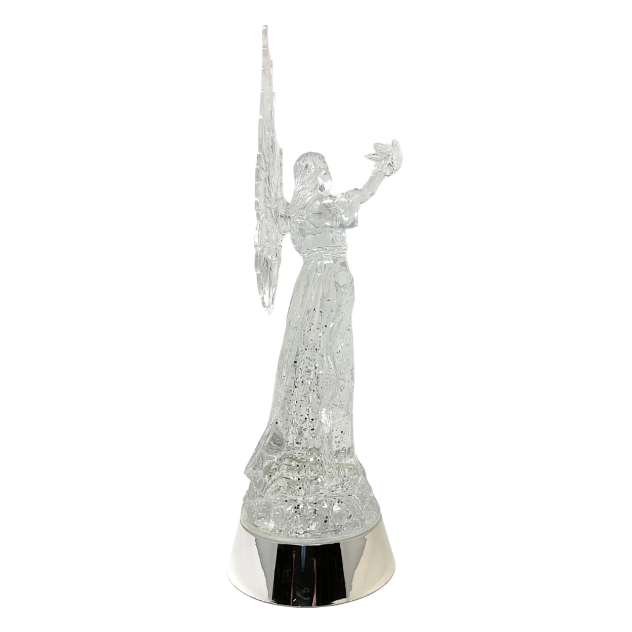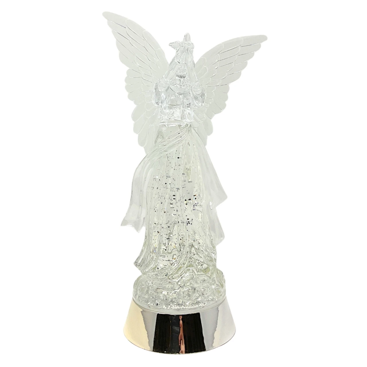 Embrace the serenity of the holidays with our Angel Holding Dove LED Water Shimmer. Standing 14 inches tall, this angelic figure cradles a peaceful dove, set against a sparkling liquid backdrop filled with swirling glitter. The RGB LED lights transition through a rainbow of colors, casting a heavenly glow. Whether displayed on a mantel or as a centerpiece, it’s sure to bring tranquility and joy to your festive celebrations.