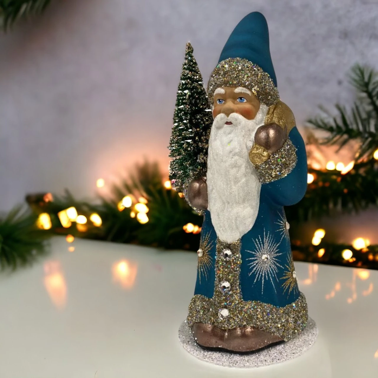 Add a touch of magic to your holiday decor with the Schaller Aqua Stars Santa Candy Container. This beautifully crafted Santa features a glittering blue coat adorned with sparkling stars and festive details.