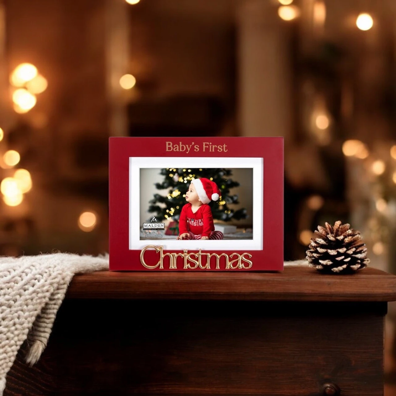 Capture the magic of your little one’s first holiday with this Baby’s First Christmas Frame, designed to fit a 4×6 or 5×7 photo. The bold red frame with gold “Christmas” text adds a festive touch, making it a beautiful keepsake for the family.