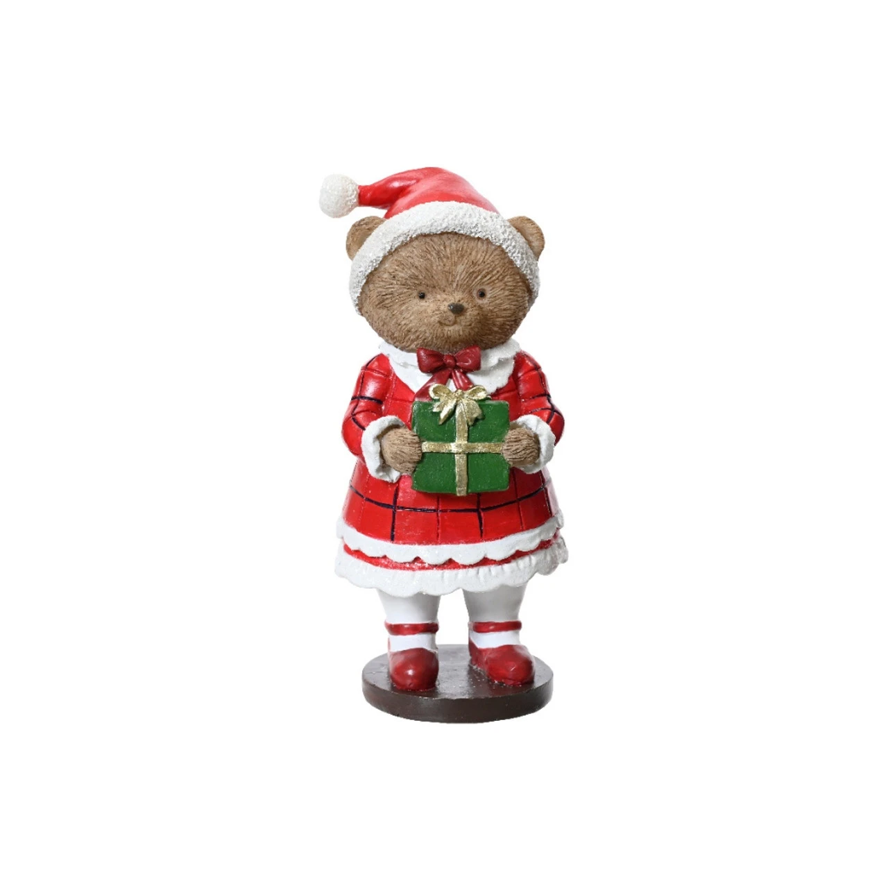 Add a touch of festive charm to your holiday decor with this adorable bear in a red dress figurine. This cute bear is crafted from high-quality polyresin. Dressed in a delightful red dress and holding a green present, this figurine is perfect for adding a whimsical touch to your mantel, shelf, or tabletop display. Bring holiday cheer and joy to your home with this charming bear figurine.
