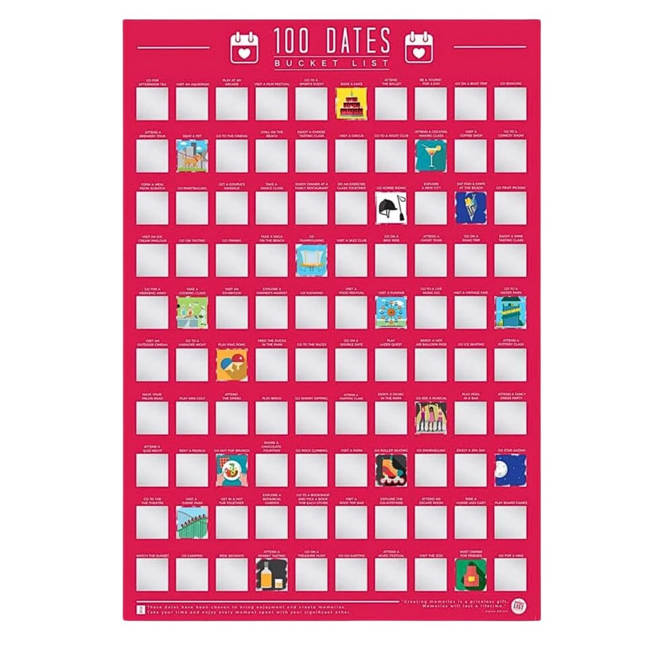 Turn date nights into unforgettable adventures with the Bucket List: 100 Dates Scratch-Off Poster! This fun, interactive poster features 100 creative date ideas, each hidden under a scratch-off panel. Scratch off a new idea and enjoy exploring unique activities together!