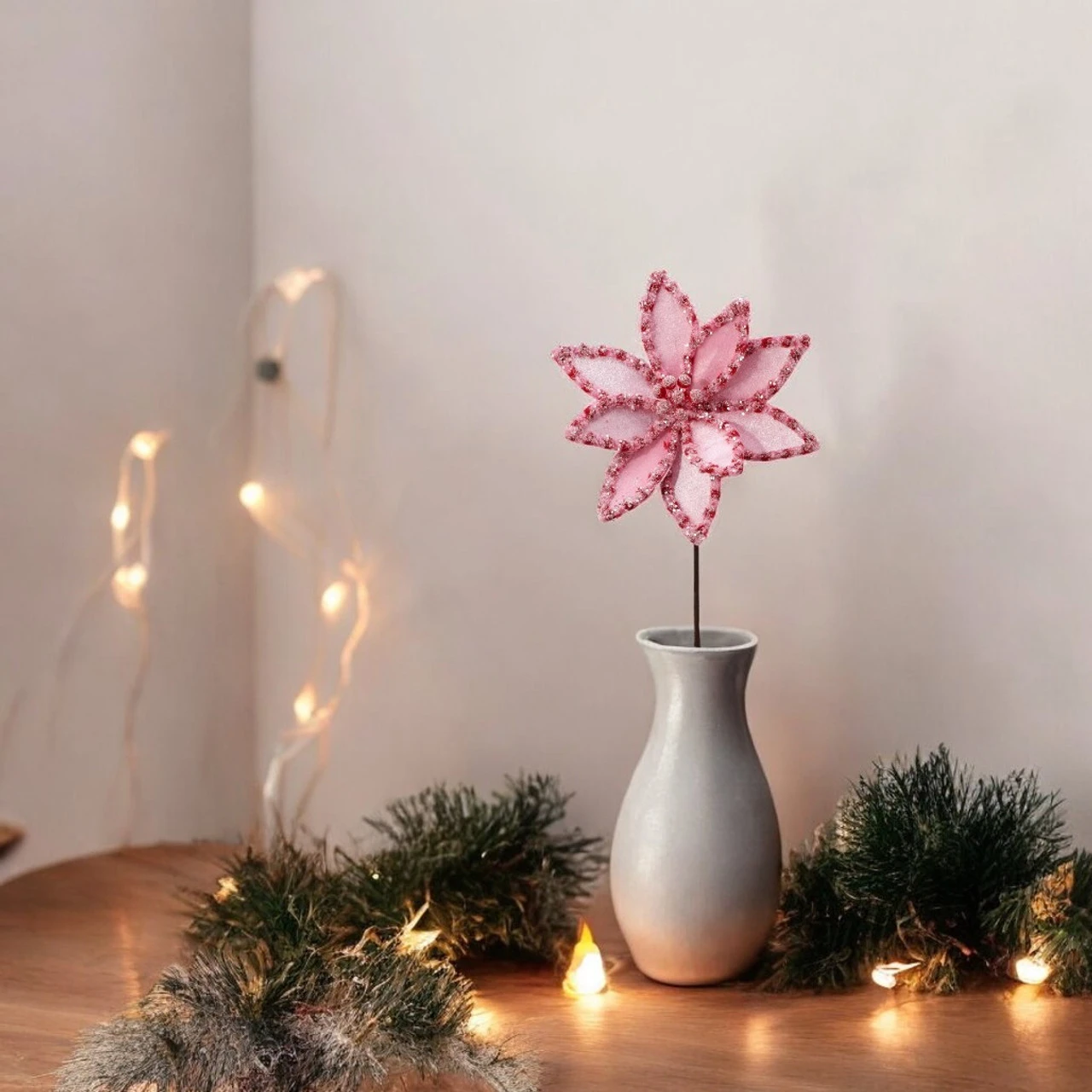 Brighten up your holiday decor with this whimsical 22″ Candy w/Snow Glitter Poinsettia Stem. Featuring vibrant pink petals adorned with candy-like glitter and frosty snow accents, this poinsettia stem brings a sweet and festive touch to any arrangement.