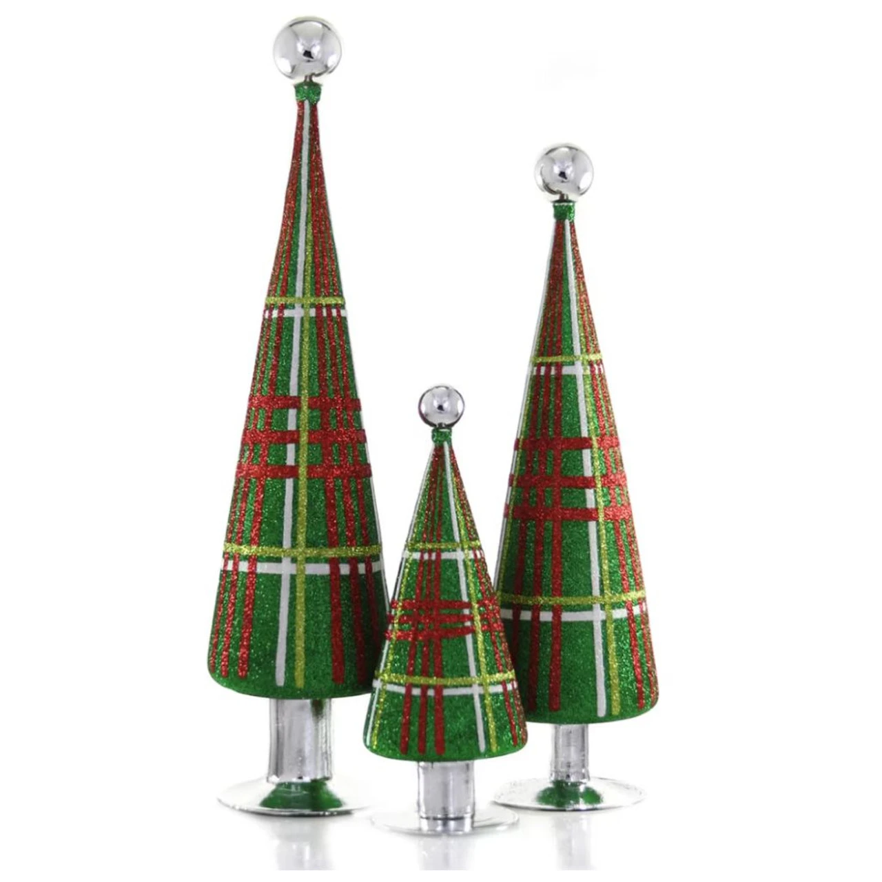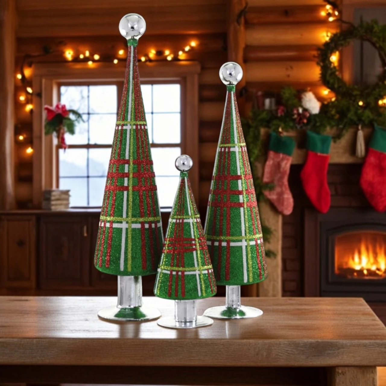 Bring bold holiday charm to your décor with the Cody Foster Glitter Plaid Tree Set in Green. This set of three cone-shaped trees features vibrant green glitter with classic red, white, and green plaid striping, topped with gleaming silver orbs.