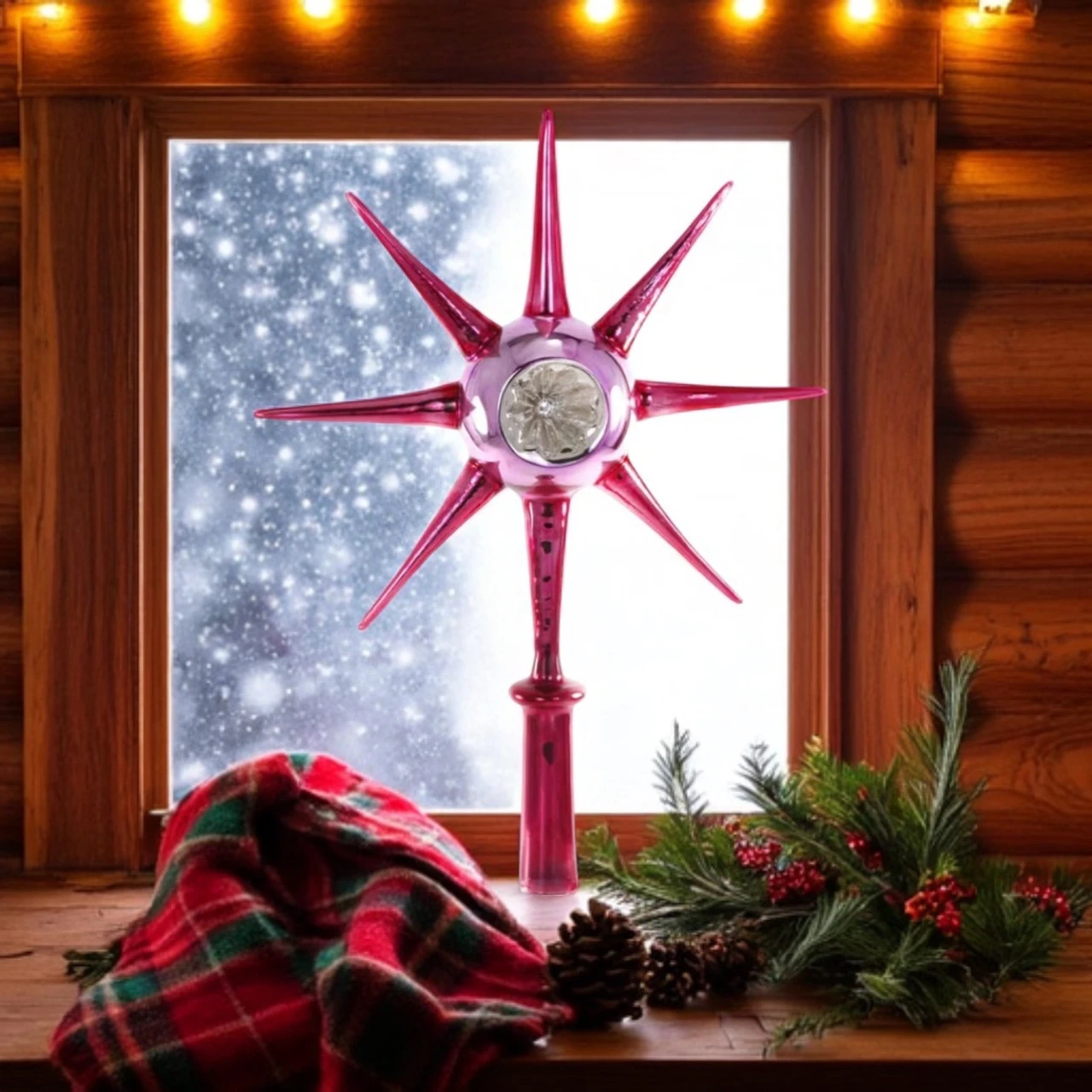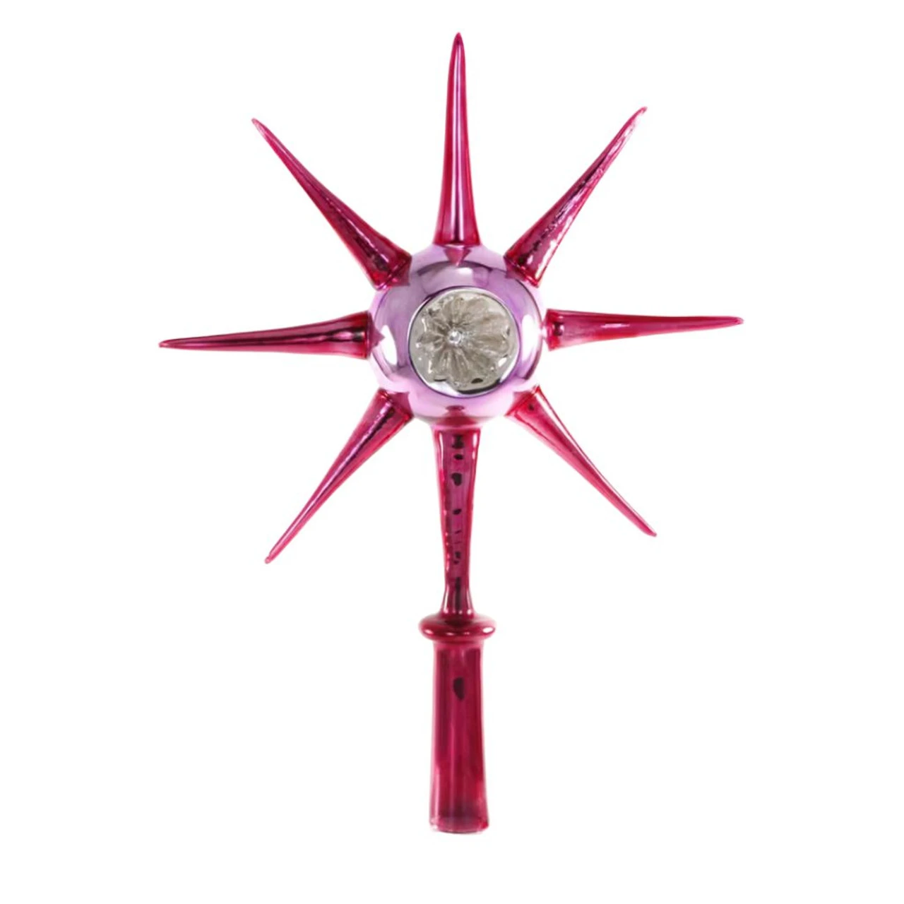 Add a blast of vintage glam to your holiday tree with the Cody Foster Star of Whimsy Tree Topper in playful pink and bold red! With spiked starburst rays and a glimmering silver reflector, this glass topper brings mid-century magic and undeniable style.
