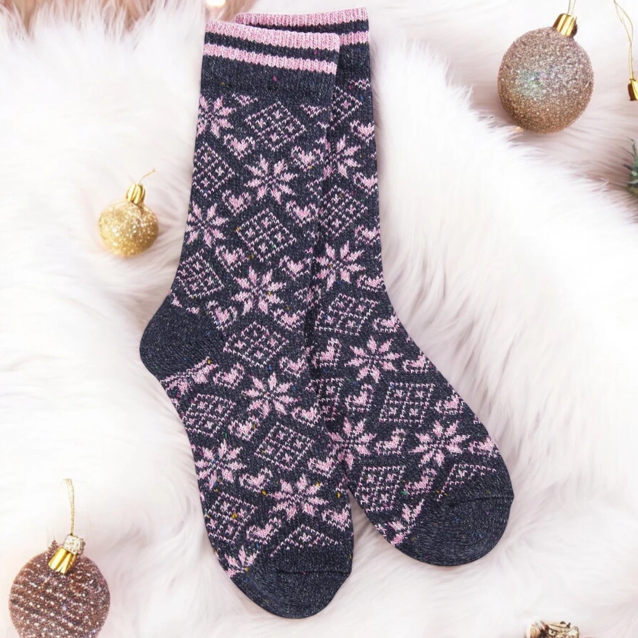 Add a touch of festive charm to your winter wardrobe with the Diamond Denim Holiday Confetti Crew Socks! These cozy crew socks feature a stylish diamond and snowflake pattern in soft pinks on a denim-blue background, accented with flecks of confetti yarn for extra cheer.