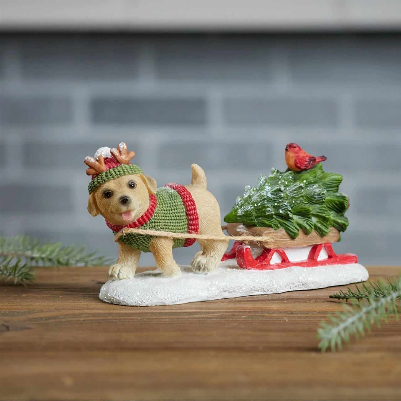 Add a playful touch to your holiday decor with this charming Dog Pulling Sleigh Figurine. Measuring 8 inches long and 3.25 inches tall, this adorable resin figure features a festive pup dressed in a cozy sweater and antlers, pulling a sleigh filled with a Christmas tree and a cheerful bird companion. Perfect for bringing a fun and whimsical vibe to your Christmas display, this figurine is sure to spread joy and holiday cheer to all who see it.