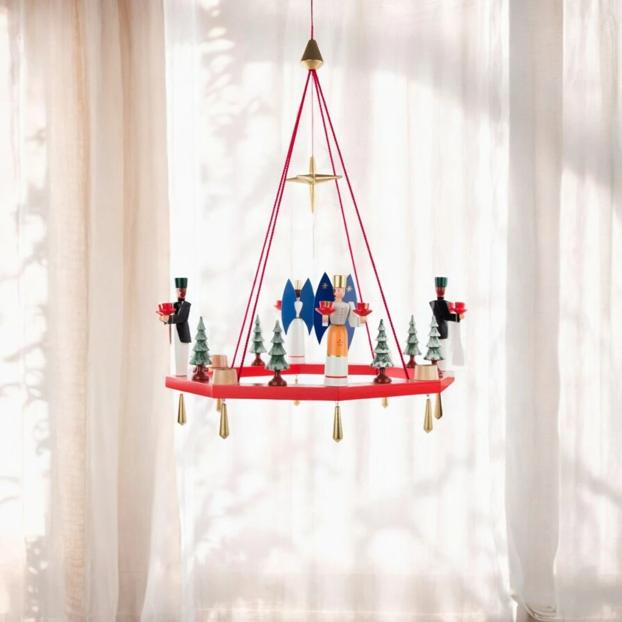 Add an enchanting touch to your holiday decor with this handcrafted Dregeno Chandelier with Angel and Miner. Hand made in Germany from quality wood, this festive centerpiece showcases classic Erzgebirge craftsmanship with delicate figures of an angel and miner, evergreen trees, and candleholders. Dregeno, a cooperative of woodturners founded in 1919 in Seiffen, has been preserving traditional craftsmanship for over 100 years. Designed for use with pyramid candles (sold separately), this timeless piece makes a stunning addition to your Christmas celebrations.