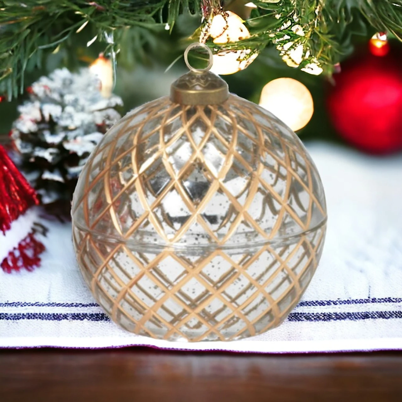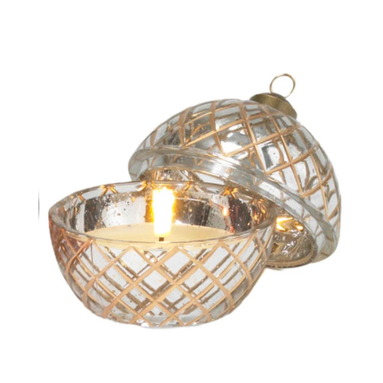 Its silver lattice pattern over clear glass provides a chic, reflective beauty. Effortless to hang, it blends seamlessly with your winter wonderland theme while offering an enchanting, flickering light that promises to enchant all night long.