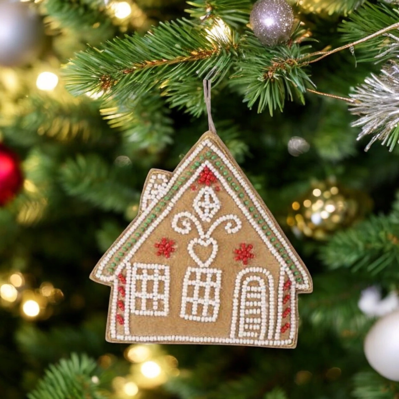 Add a sweet touch to your holiday decor with this Embroidered & Beaded Gingerbread House Ornament! Designed with festive details, this charming piece features a cozy gingerbread house with intricate beaded accents in white, red, and green.