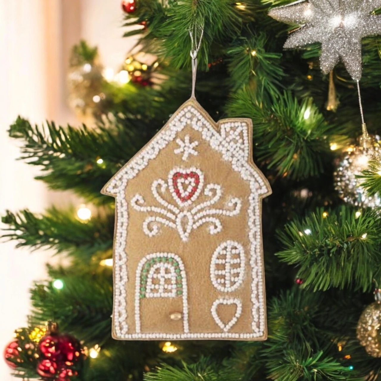 Featuring a cozy look with embroidered details and a festive white roof, itโs perfect for gingerbread lovers and holiday collectors alike. Whether hung on a tree or gifted to a loved one, this delightful ornament will bring joy to your festive celebrations.