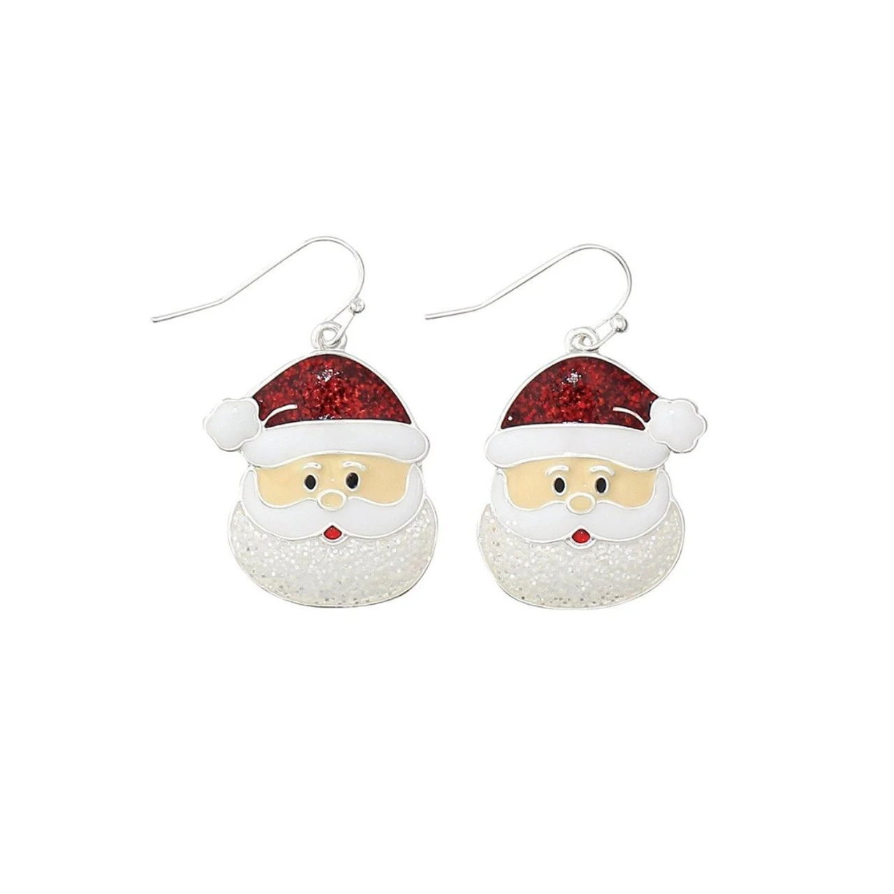 Add jolly cheer to your holiday look with these Enamel Santa Face Earrings by Periwinkle! Featuring glittery red hats, rosy cheeks, and sparkling white beards, these lightweight dangles are full of festive flair.