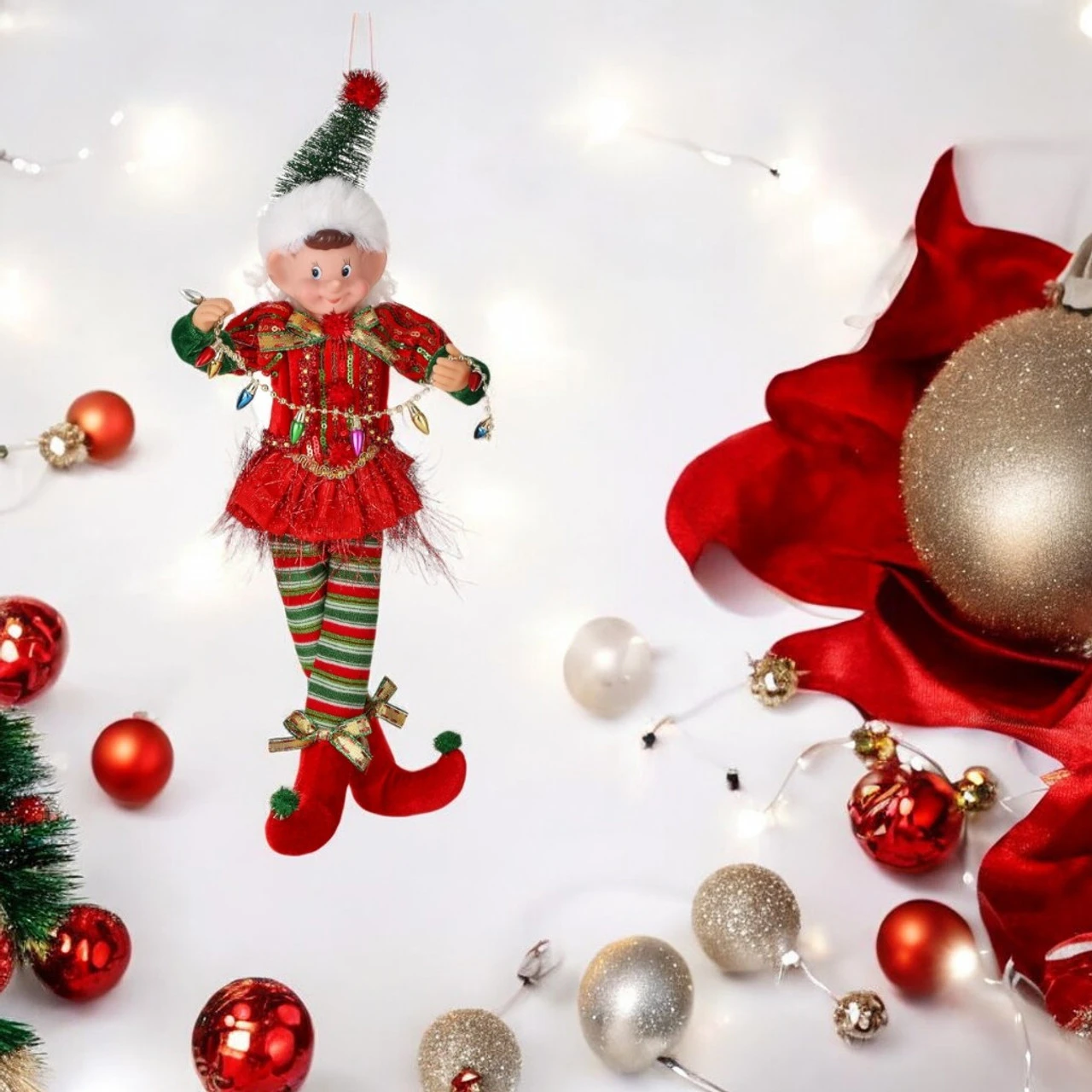 Add a dash of whimsy to your Christmas decor with this 15″ Fabric Girl Tinsel Pixie Elf Ornament. Dressed in a festive red and green ensemble, complete with shimmering sequins and striped leggings, this playful elf is sure to bring joy to your holiday celebrations.