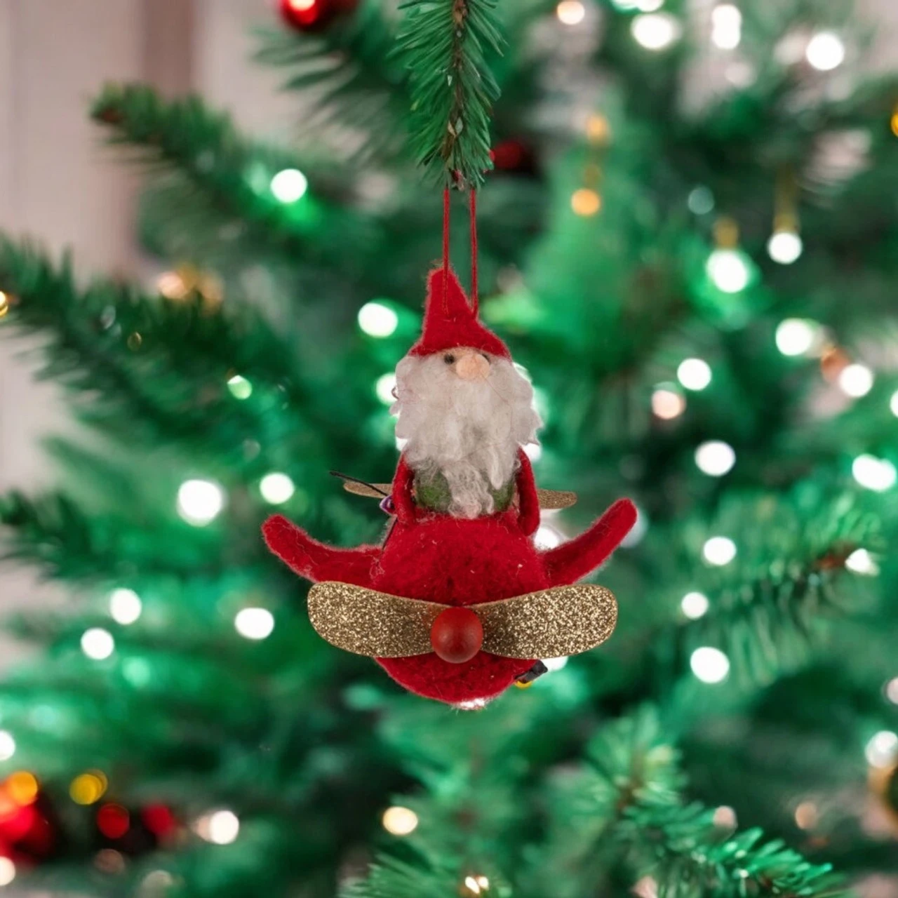 Made from felted wool with intricate details, this lightweight ornament brings a whimsical and adventurous touch to your Christmas tree. Perfect for aviation enthusiasts or anyone who loves unique decorations, this playful Santa ornament is sure to delight holiday guests.