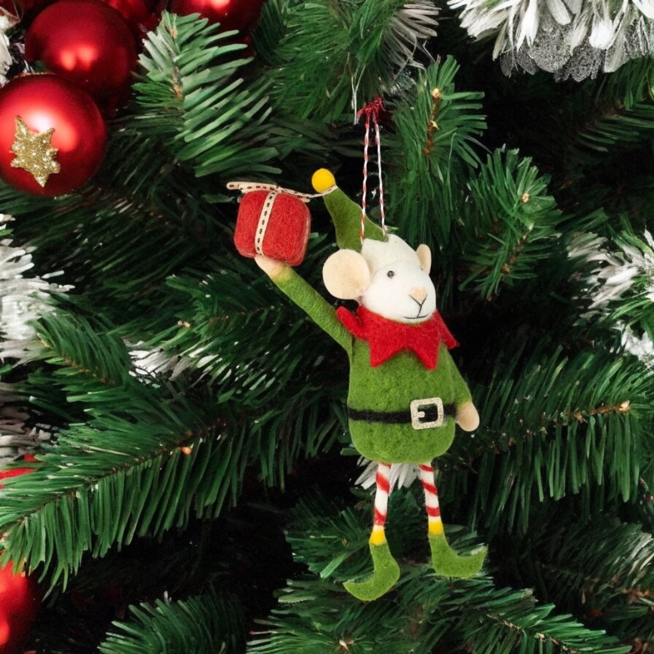 Spread holiday cheer with this Felt Elf Mouse in Green Suit Holding Present Ornament! This adorable handcrafted mouse is dressed as a festive elf, complete with a green suit, red collar, striped leggings, and pointy shoes.