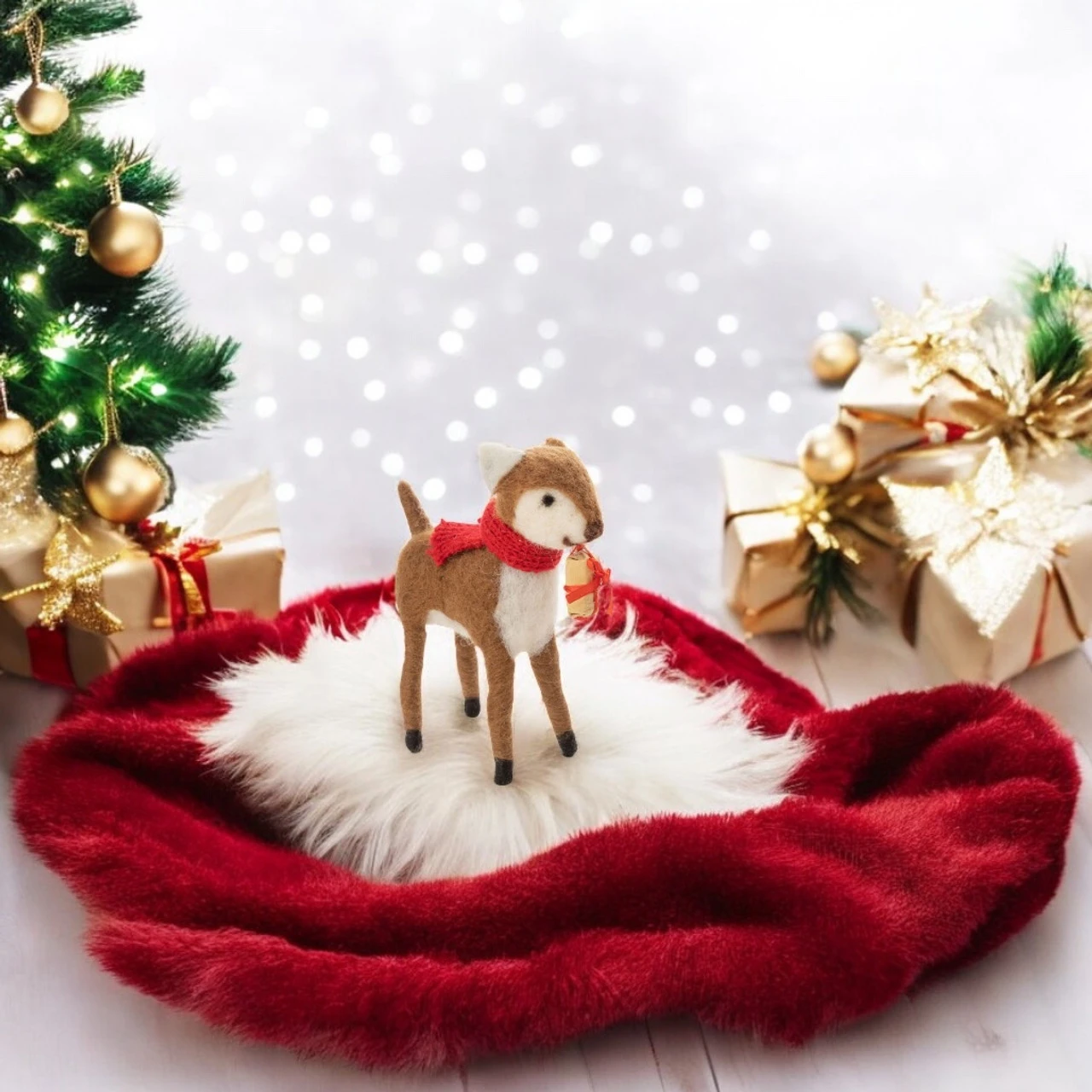 Bring charm and cheer to your holiday decor with this Felt Reindeer Holding Present! Dressed in a cozy red scarf and carrying a beautifully wrapped gift, this handcrafted reindeer captures the spirit of Christmas.
