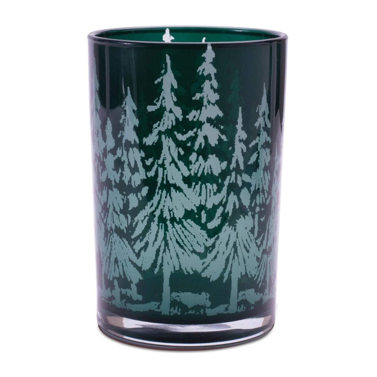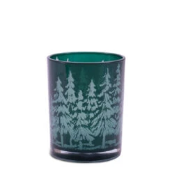 Add woodland elegance to your décor with this Forest Design Glass Candle Holder Set. This set includes two sizes—5 inches and 7 inches tall—crafted from sleek green glass with a frosted evergreen tree design for a cozy, wintry feel.