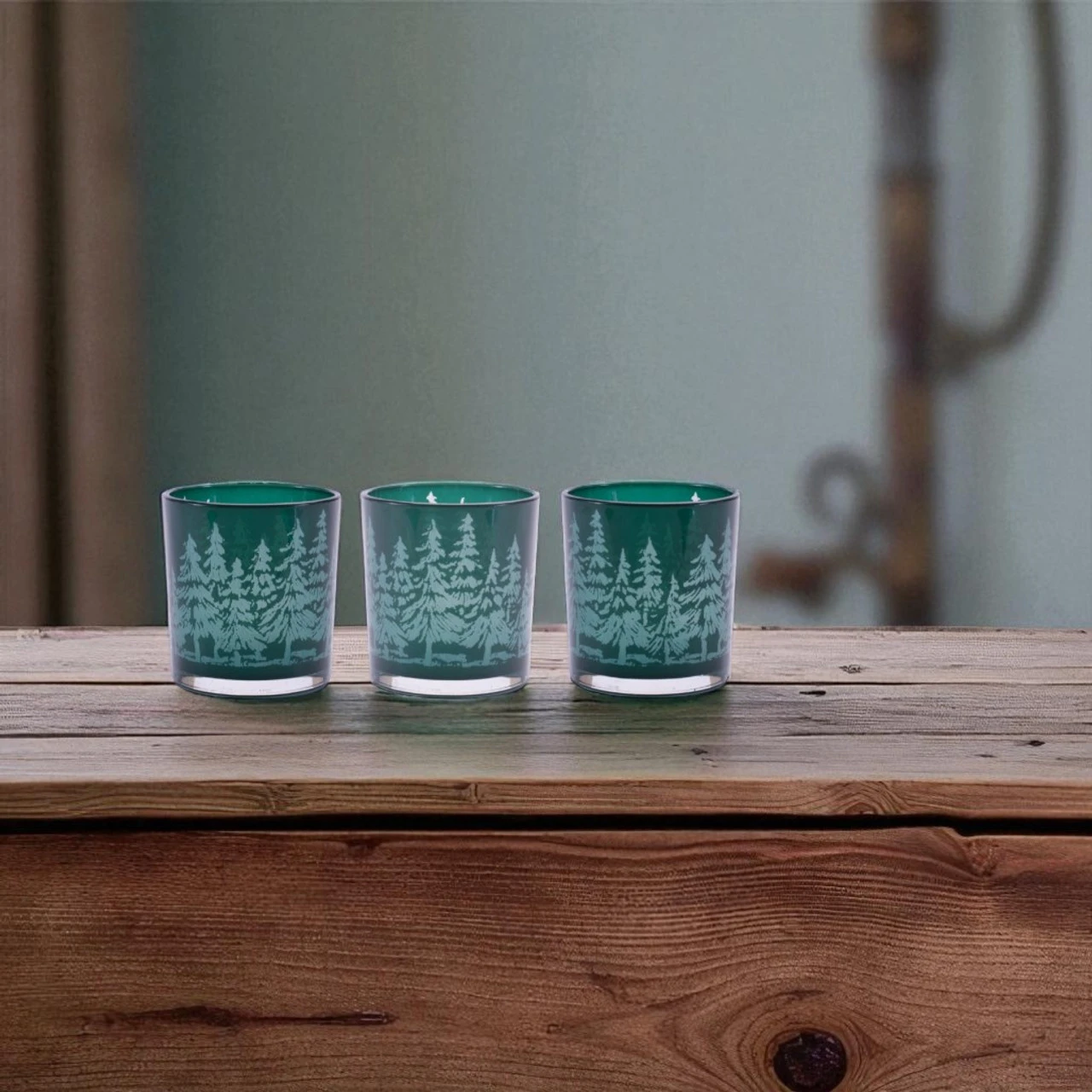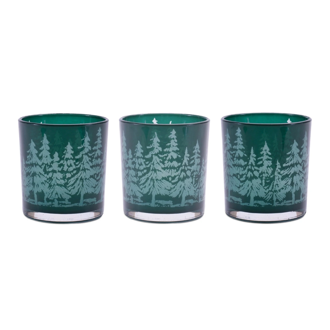 Bring a woodland touch to your décor with this Forest Design Glass Votive Holder Set! This set of three 3-inch glass holders features a frosted evergreen tree pattern on deep green glass for a cozy winter feel.