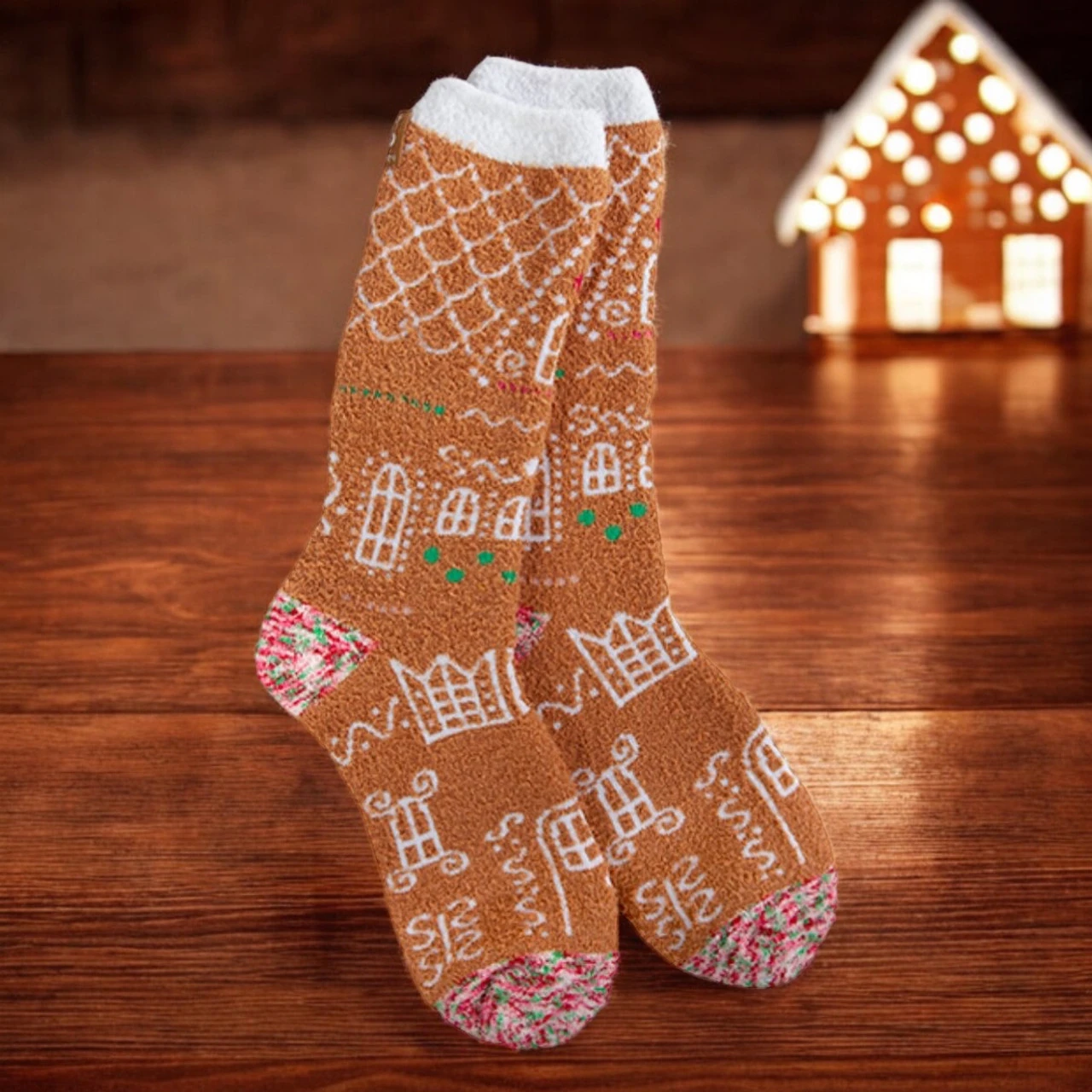 Embrace the holiday spirit with these Gingerbread House II Cozy Crew Socks! Designed to resemble a charming gingerbread house with intricate white icing details, these socks add a playful touch to your winter wardrobe.