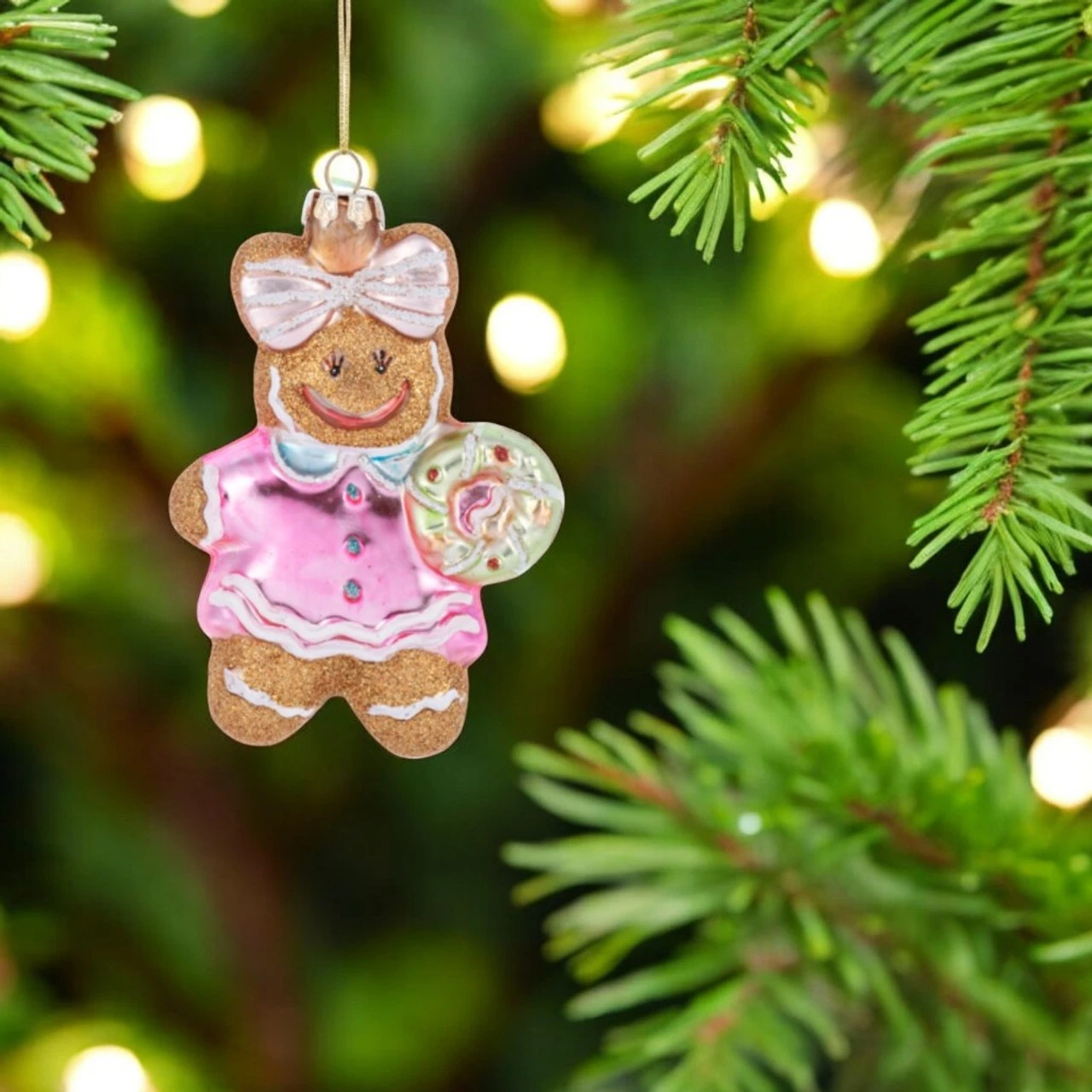 This sweet Glass Gingerbread Girl Ornament is dressed to impress in a sparkly pink dress and big glittery bow. Standing 4.75 inches tall, she carries a festive frosted donut and is dusted with holiday cheer from head to toe.