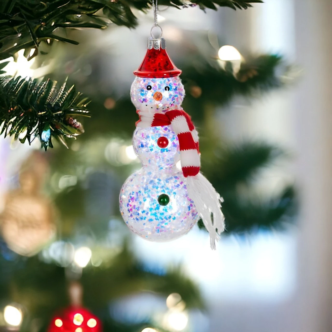 Light up your holidays with our Glowing Snowman with Red Hat Ornament! This enchanting piece features a shimmering body filled with colorful confetti and a vibrant red hat, making it a standout addition to any Christmas tree.