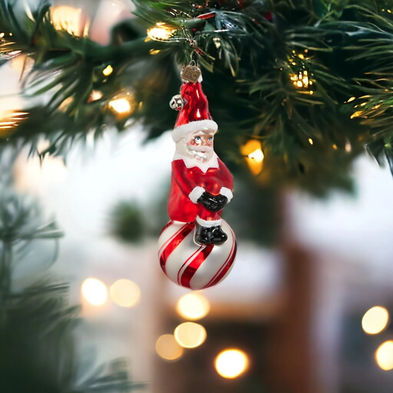 Add a playful touch to your holiday decor with this 6″ Having a Ball Santa Ornament. Featuring Santa Claus joyfully perched on a red and white striped ball, this whimsical ornament brings a sense of fun and festivity to your Christmas tree. Crafted from high-quality glass, it combines charming design with durability.