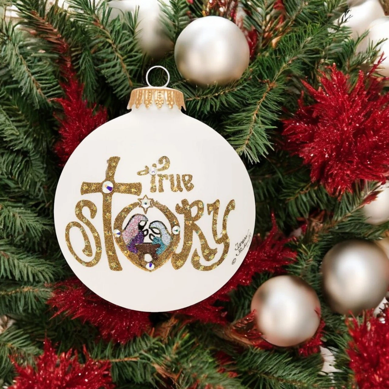 Celebrate the true meaning of Christmas with the Heart Gifts by Teresa True Story ornament. This 3.5” glass ornament beautifully captures the Nativity scene with glittering details and Swarovski crystals. Hand-painted with care in North Carolina, it’s a timeless keepsake that reflects faith and joy. Perfect for honoring the holiday’s spiritual side, this handcrafted ornament makes a thoughtful gift or cherished addition to your own holiday decor.