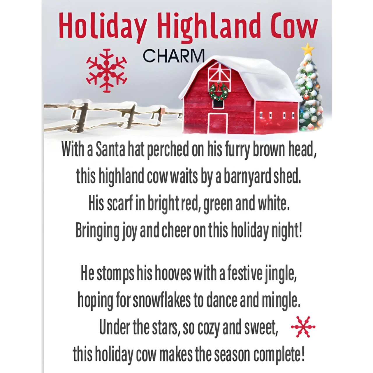 Add a touch of cozy barnyard cheer with our Holiday Highland Cow Pocket Charm! Standing 1.5″ tall, this fuzzy brown cow sports a jolly red Santa hat and a green and white scarf. Crafted from durable polyresin and polyester, he’s ready to stomp into your heart with festive spirit.