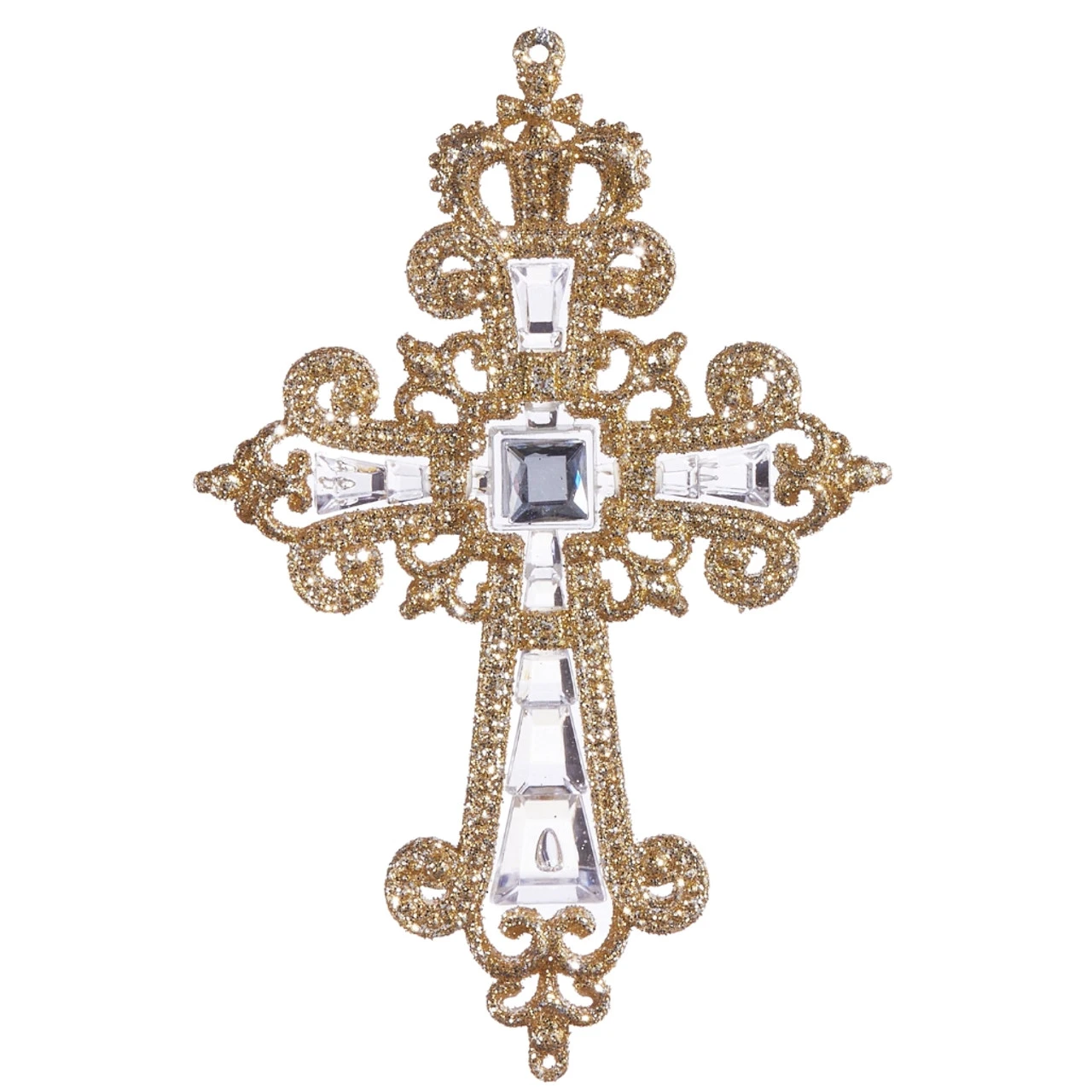 Introducing our 6.5-inch Jeweled Glittering Gold Cross Ornament – a majestic and elegant decoration that will infuse divine inspiration into your holiday celebrations! This exquisite 6.5-inch cross ornament is adorned with intricate jeweled accents, a glittering gold finish, and a captivating diamond-like jewel at its center, making it a truly remarkable addition to your festive decor. This radiant ornament features a delicate gold cross design, lavishly embellished with sparkling jewels that catch the light and shimmer magnificently. The eye-catching diamond-like jewel at the heart of the cross adds an extra touch of opulence, setting this ornament apart from the rest. Perfect for adding a touch of spiritual beauty to your Christmas tree, mantel, or tabletop display, this dazzling 6.5-inch ornament is sure to become a cherished part of your holiday traditions. It also makes a thoughtful and meaningful gift for friends, family, or religious gatherings, capturing the true essence of the season.