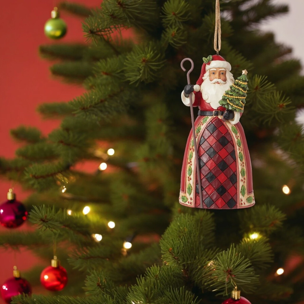 Add festive charm to your holiday decor with this Jim Shore Highland Glen Santa Staff Ornament. Featuring Santa in a buffalo plaid gown with a holly-framed cloak, he holds a miniature Christmas tree and a shepherd’s hook adorned with mistletoe.