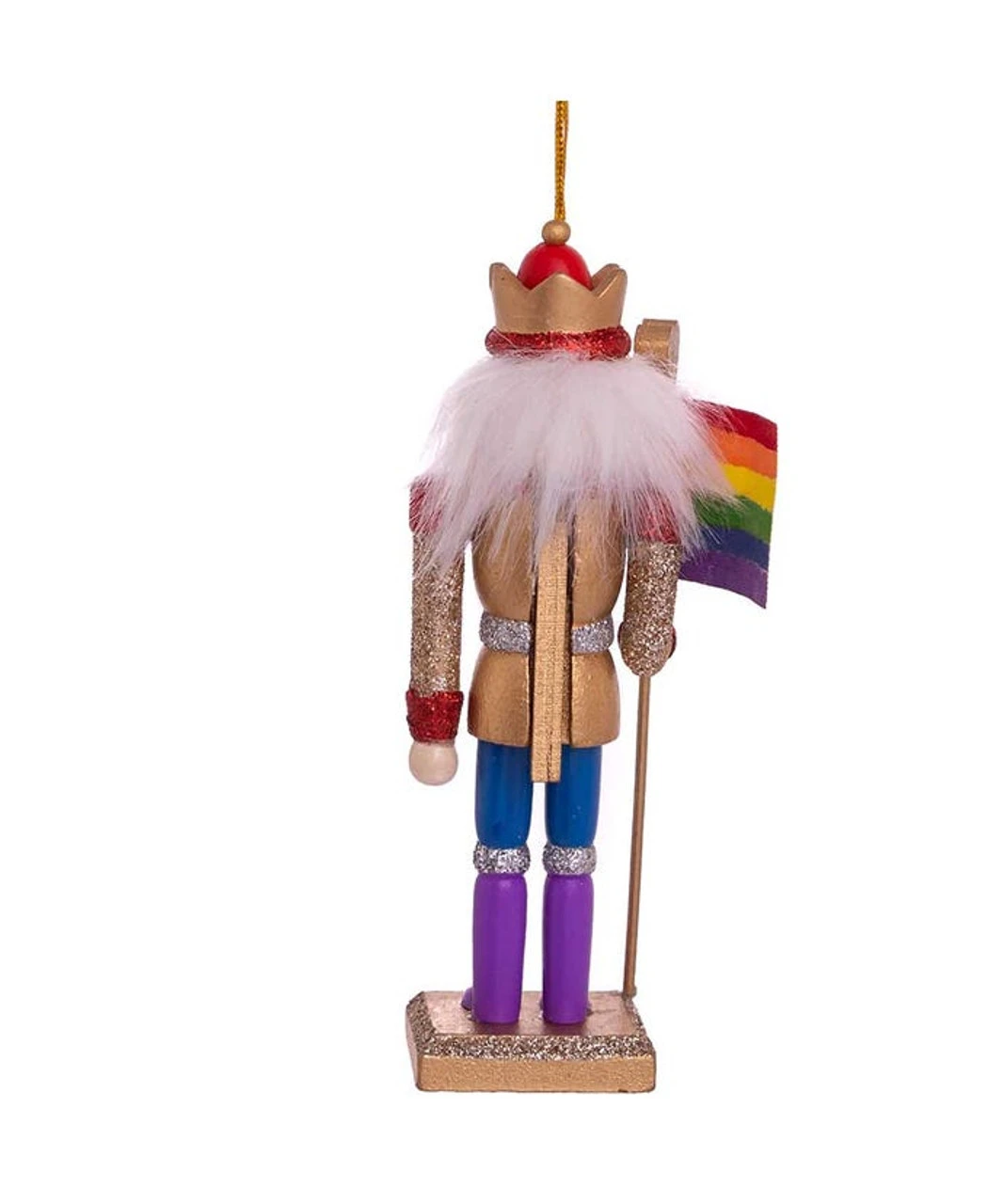 This Pride nutcracker ornament from Kurt Adler is a beautiful addition to any holiday décor. It features the iconic Pride rainbow colors with multi-color glittered accents. This nutcracker is holding the Pride Flag and stands on a gold glittered base.