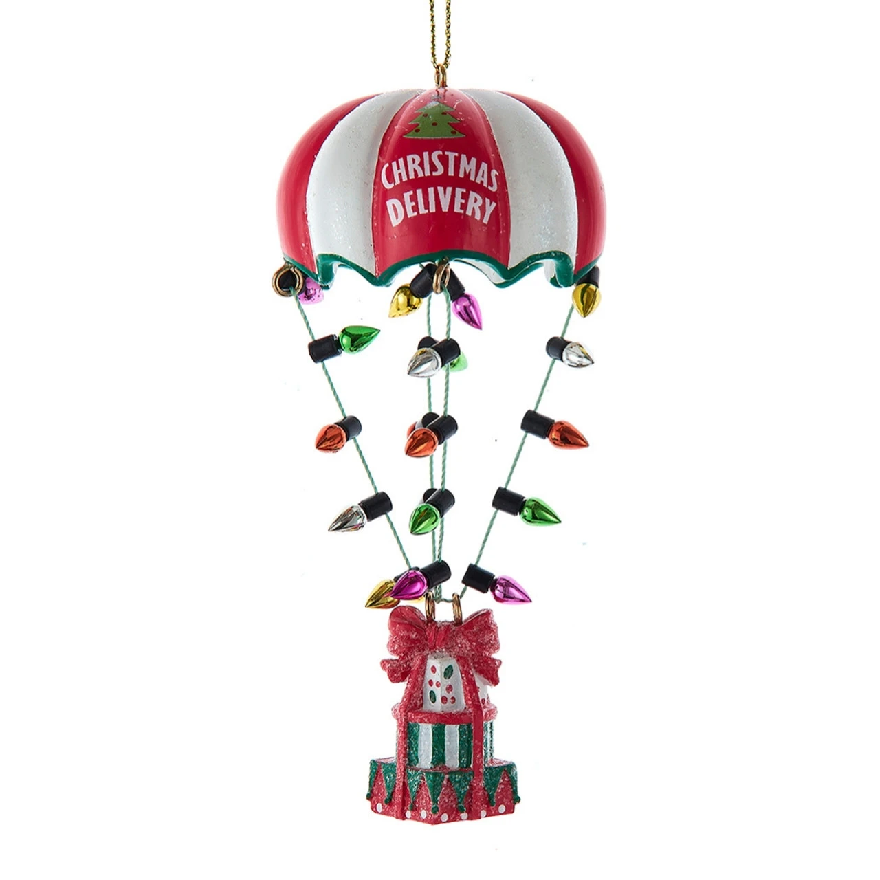 Send holiday cheer soaring with Kurt Adler’s Christmas Delivery Hot Air Balloon Ornament! This 5-inch delight features a red-and-white striped balloon, a glittery present basket, and colorful string lights that look ready to twinkle.