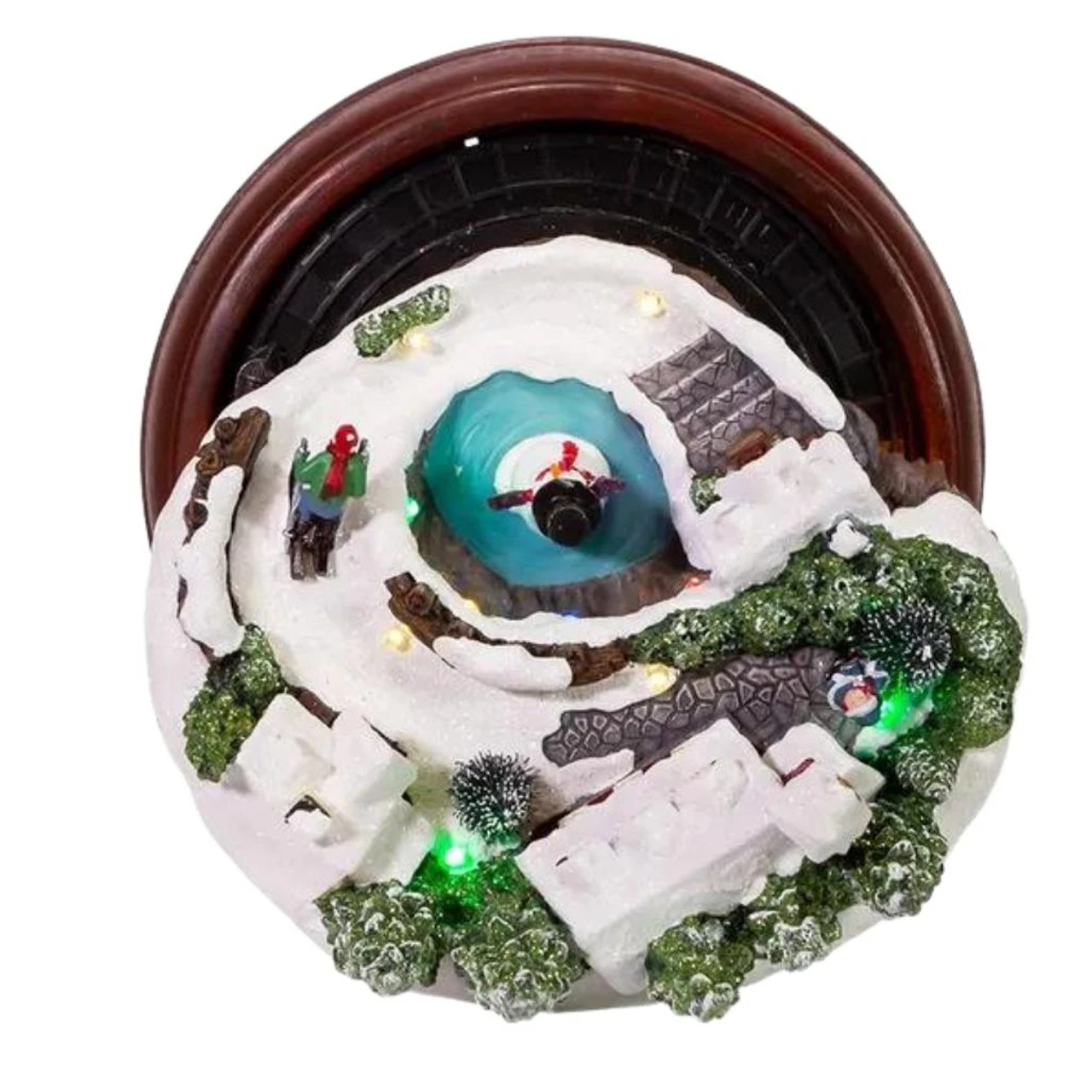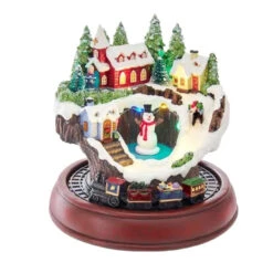 This battery-operated LED musical Christmas Village with train tabletop décor from Kurt Adler is a fun and festive addition to any holiday décor or Christmas Village display. It features a wintry Christmas Village scene with a house in the woods surrounded by snowy trees, a snowman, a child sledding, and a train around the base. When activated, bright LED lights turn on for a festive glow, and “Jingle Bells” plays.