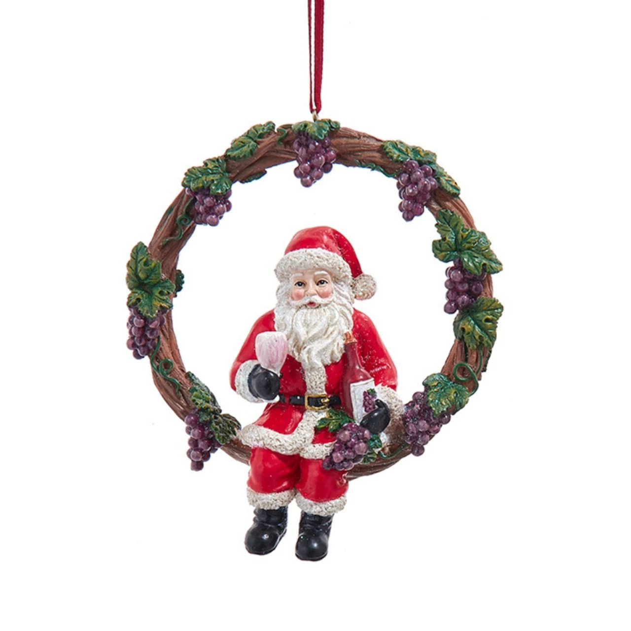 Celebrate the season with a splash of red! This 4.5″ Red Wine Vineyard Santa Ornament by Kurt Adler features jolly old Saint Nick relaxing with a glass of red wine, nestled inside a rustic grapevine wreath. Detailed with clusters of grapes and leafy vines, this resin ornament adds a festive vineyard twist to your tree.