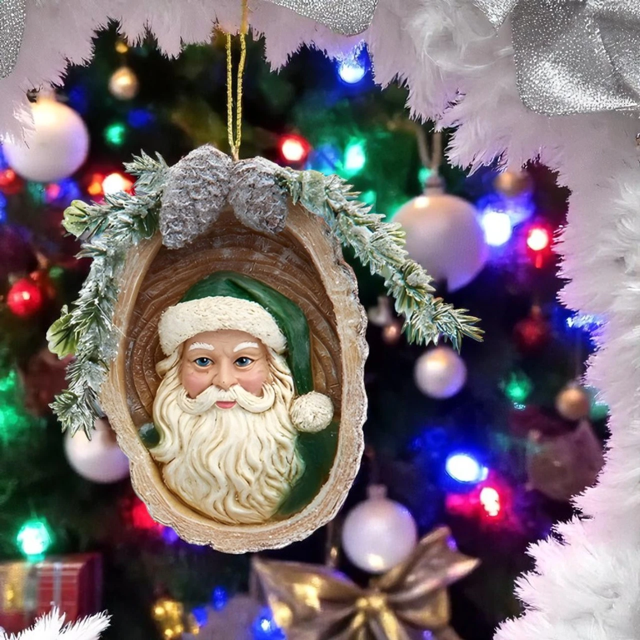 Bring the outdoors inside with this 4″ Winter Green Santa Ornament by Kurt Adler. Nestled in a sliced wood-look frame, Santa wears a deep green hat trimmed in white, radiating rustic charm. Accented with frosted pinecones and snowy evergreens, this resin ornament offers a cozy woodland feel perfect for nature-inspired trees.