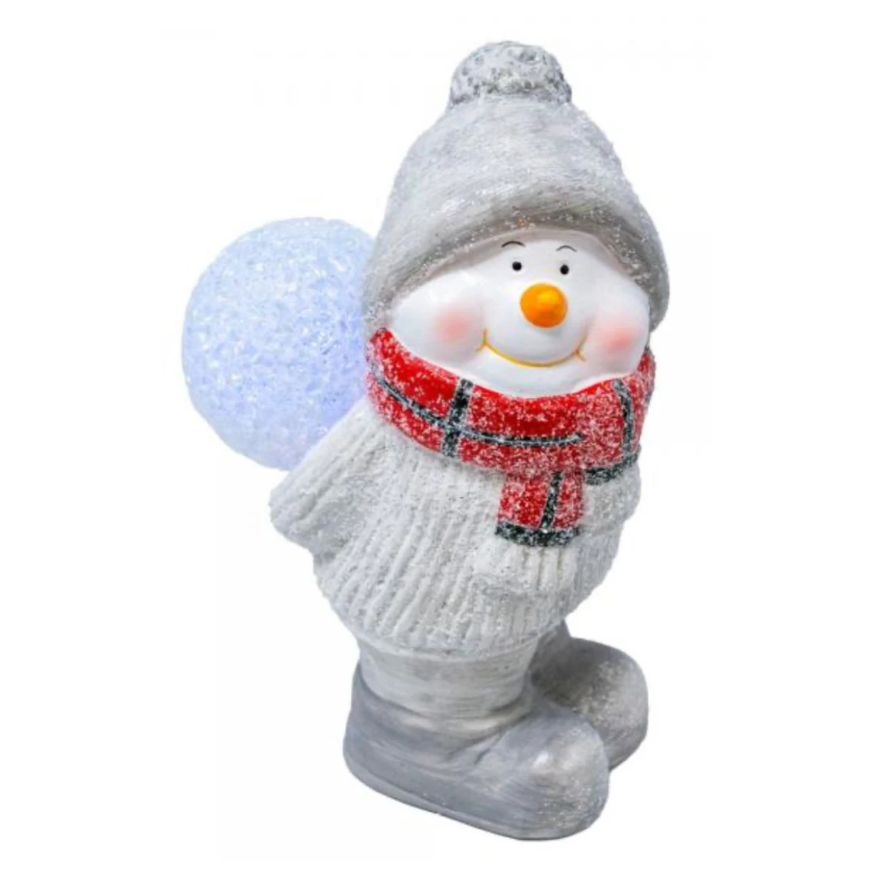 Brighten your holiday decor with this adorable LED Snowman figurine! Bundled up in a cozy gray hat, a red plaid scarf, and a textured sweater, this cheerful snowman carries a glowing color changing LED snowball that adds a magical touch to any room.