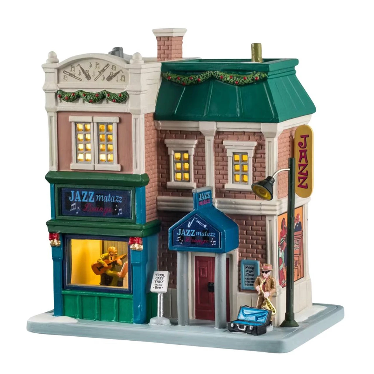 Swing into the rhythm of the holidays with Lemax Jazzmatazz Lounge. This vibrant, illuminated building features a live jazz performance scene, glowing windows, and festive wreaths. A saxophonist and guitarist add lively energy to this downtown-style lounge, making it a standout in any Christmas village.