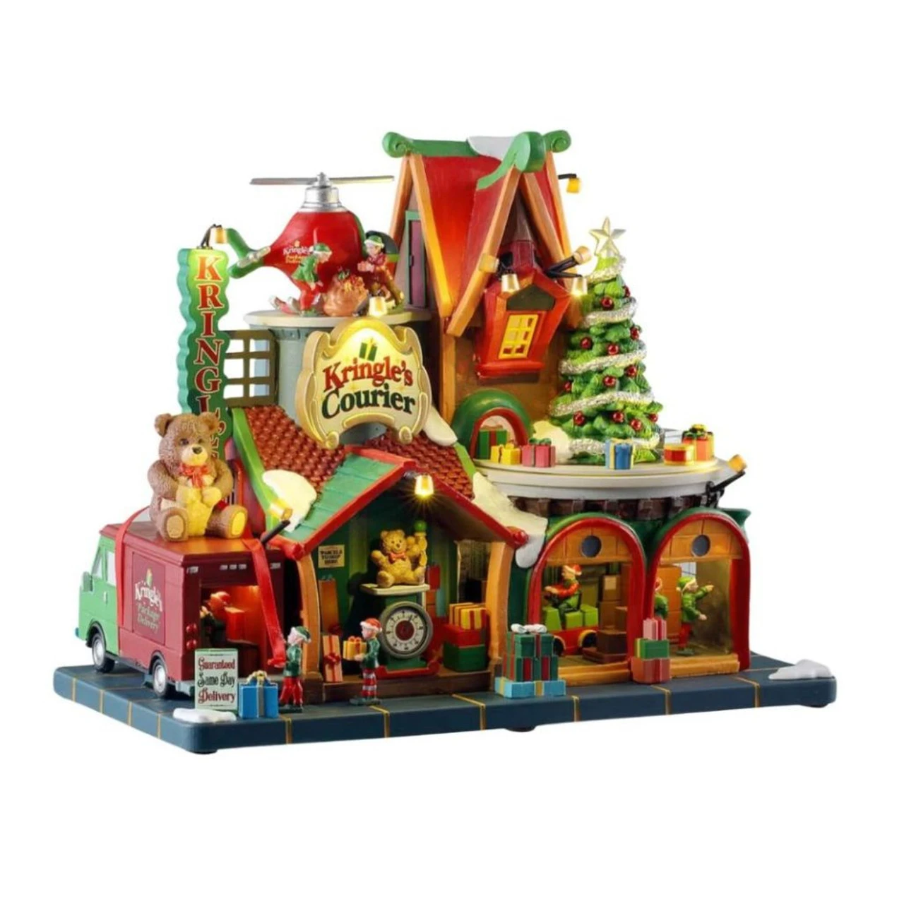 Get ready for festive deliveries with Lemax Kringle’s Courier! This vibrant ‘Sights and Sounds’ holiday centerpiece captures the magic of Santa’s delivery service, complete with elves hard at work, a cheerful delivery van, and a snow-covered rooftop adorned with toys and decorations.