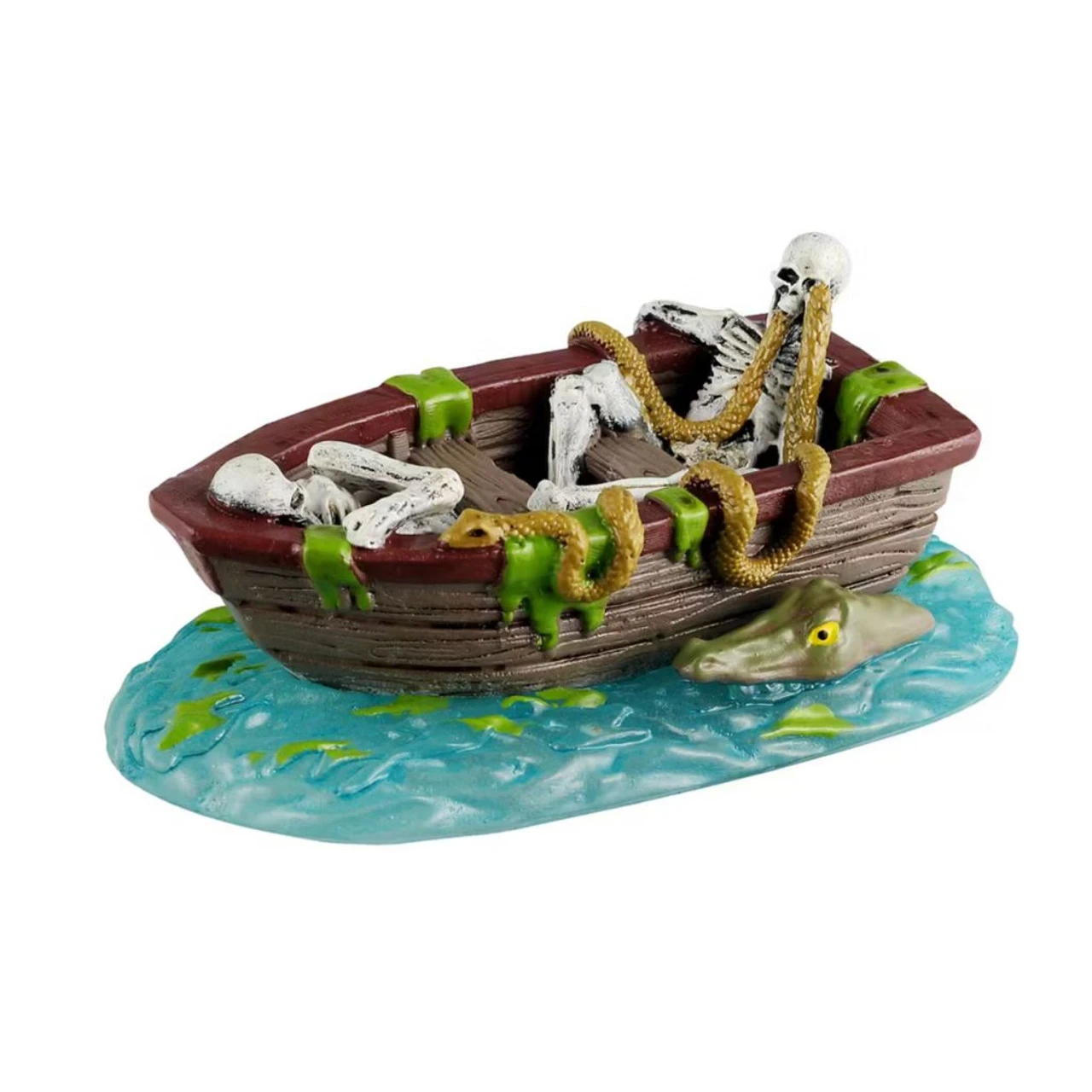 Add eerie intrigue to your Spooky Town village with the Lemax Lost In The Lagoon figurine! This spooky scene features a skeleton-filled rowboat adrift in a swampy lagoon, complete with slithering snakes, slimy green algae, and a lurking alligator.
