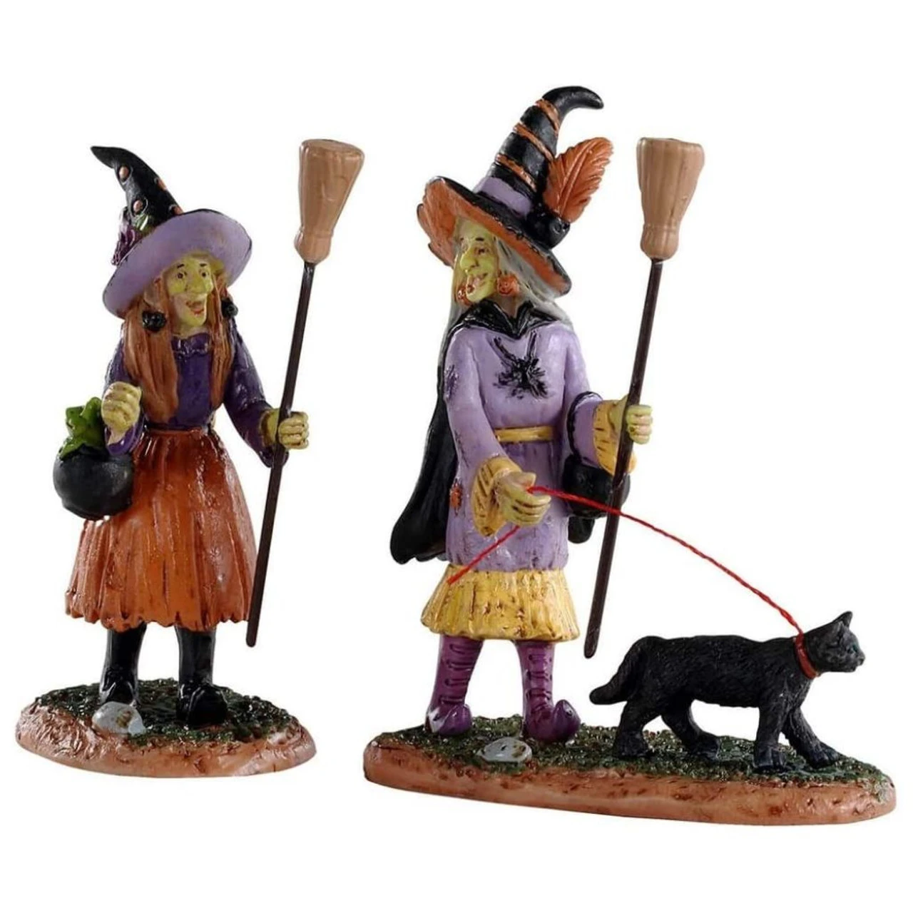These two witches are out walking their cat having fun night out on the town with brooms in hand.Â