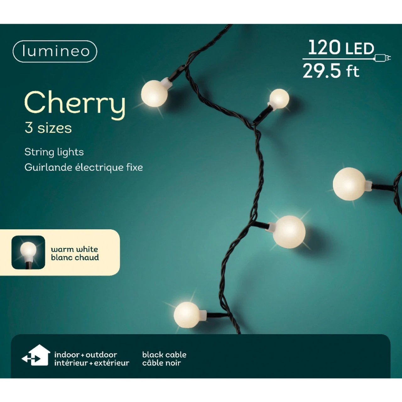 Illuminate your space with the enchanting 120 LED Warm White Cherry Lights. With a length of 29.5 feet, these lights feature three different sizes of cherry bulbs on a black wire, creating a warm and cozy ambiance.