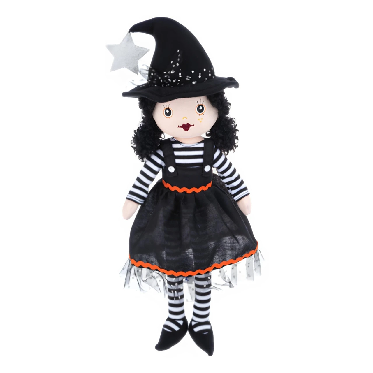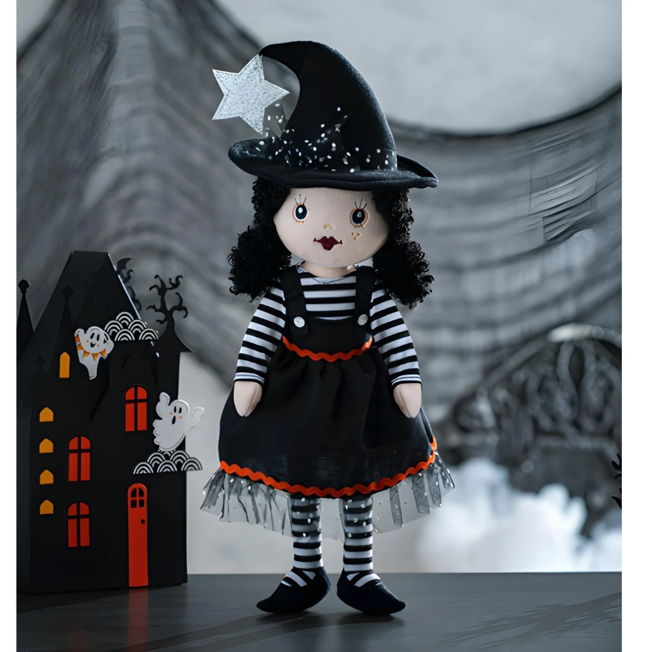 Cast a spell of charm on your Halloween decor with our Matilda Witch Doll! Standing 16 inches tall, Matilda is dressed in a whimsical black and white striped outfit with a layered black dress trimmed in festive orange. Her pointed witch hat features a glittering star and polka-dot accents, making her the star of any spooky setup.