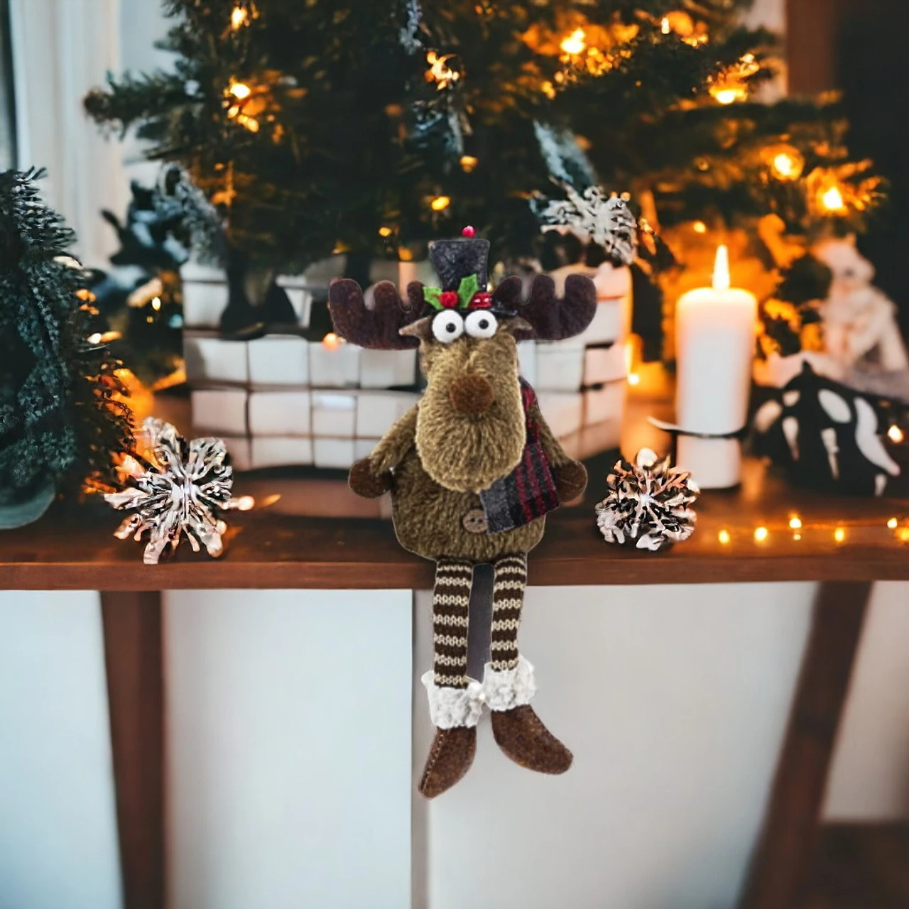 Add a touch of whimsy to your holiday decor with this Moose Sitter with Legs and Dark Grey Scarf. This adorable plush moose features a festive hat, striped leggings, and a cozy dark grey scarf, making it the perfect addition to your holiday displays.