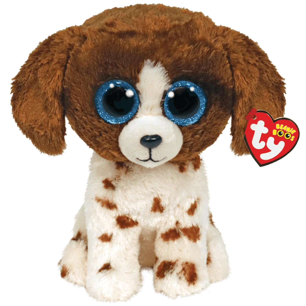 Muddles may look dirty. But, as a brown and white plush dog, Muddles is always ready to go with you.