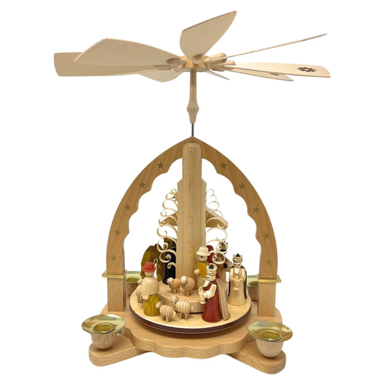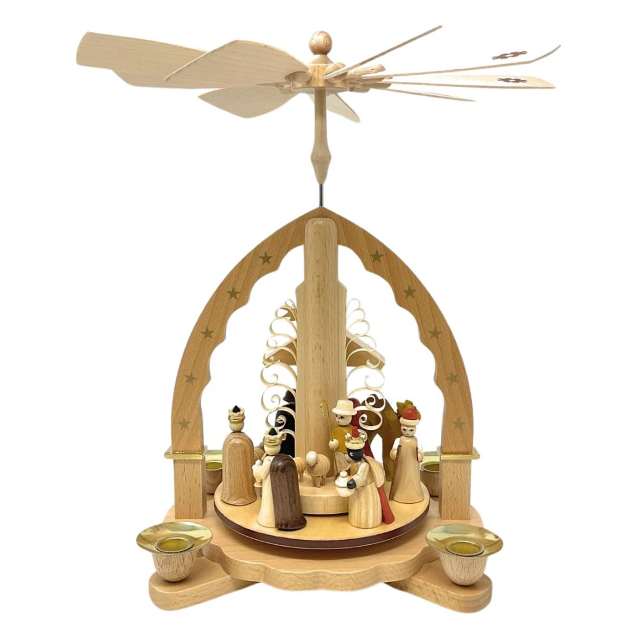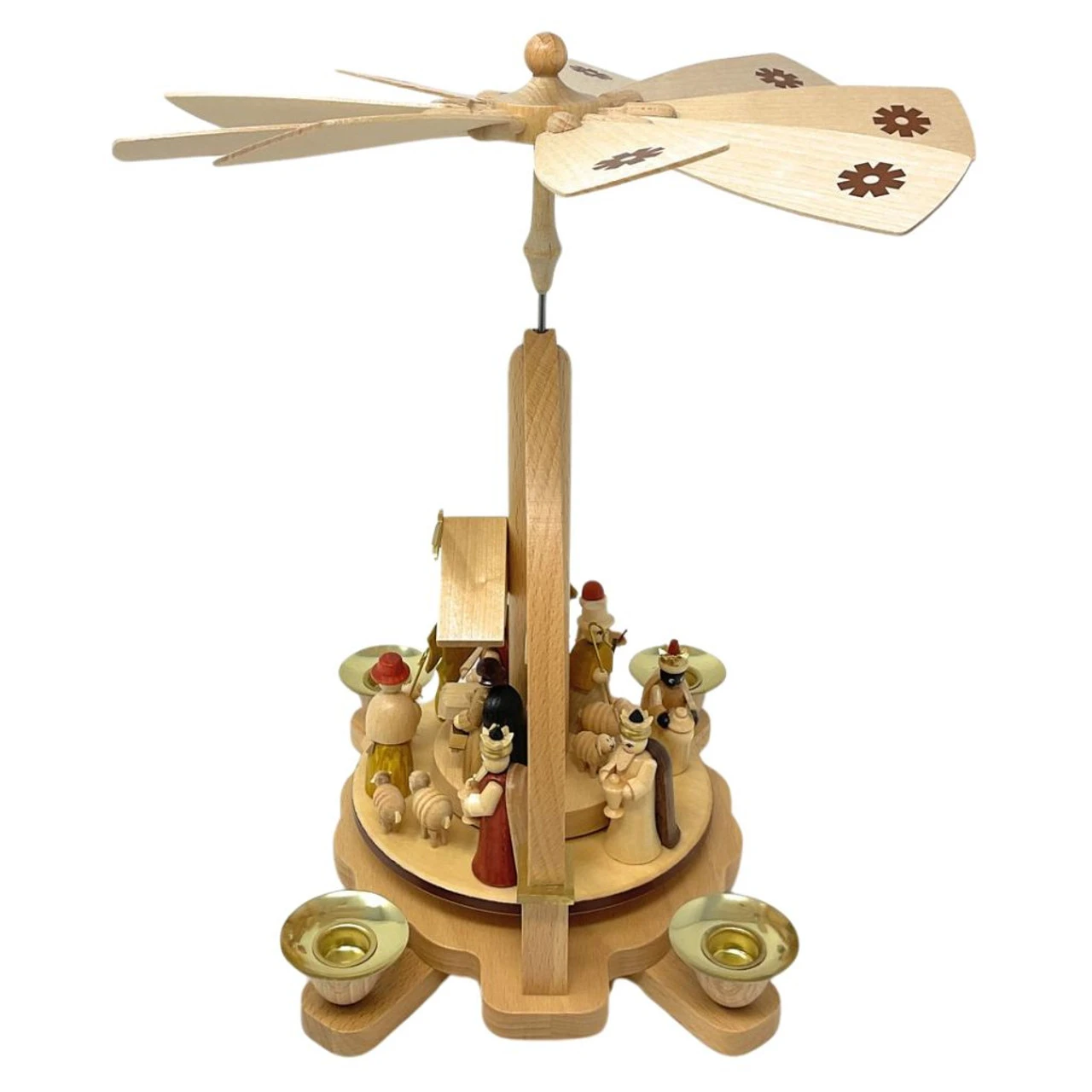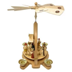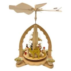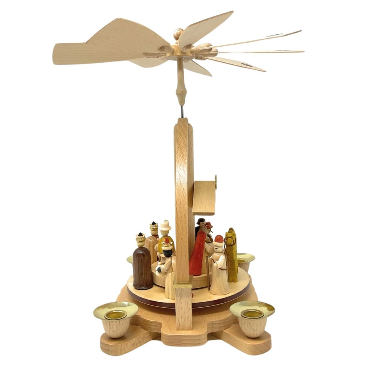 Celebrate the essence of Christmas with our Richard Glaesser Nativity Christmas Pyramid. This exquisite wooden piece features delicate figures of the Nativity scene, powered by candle heat that spins the propeller.