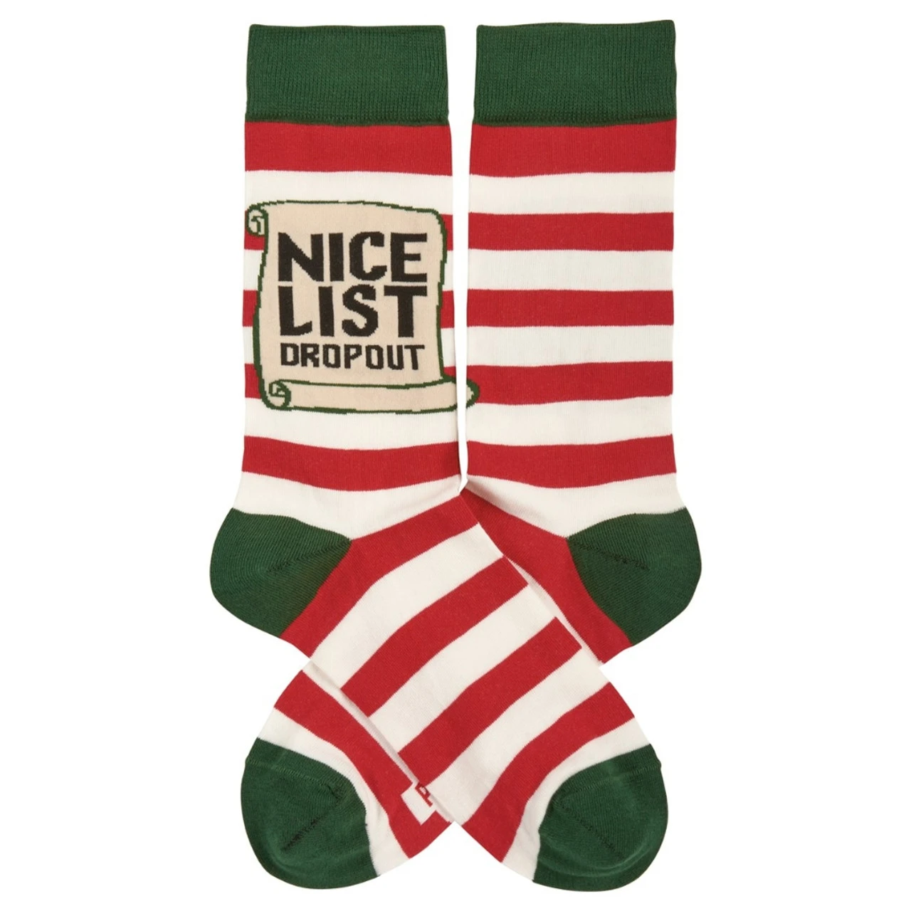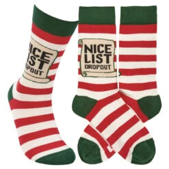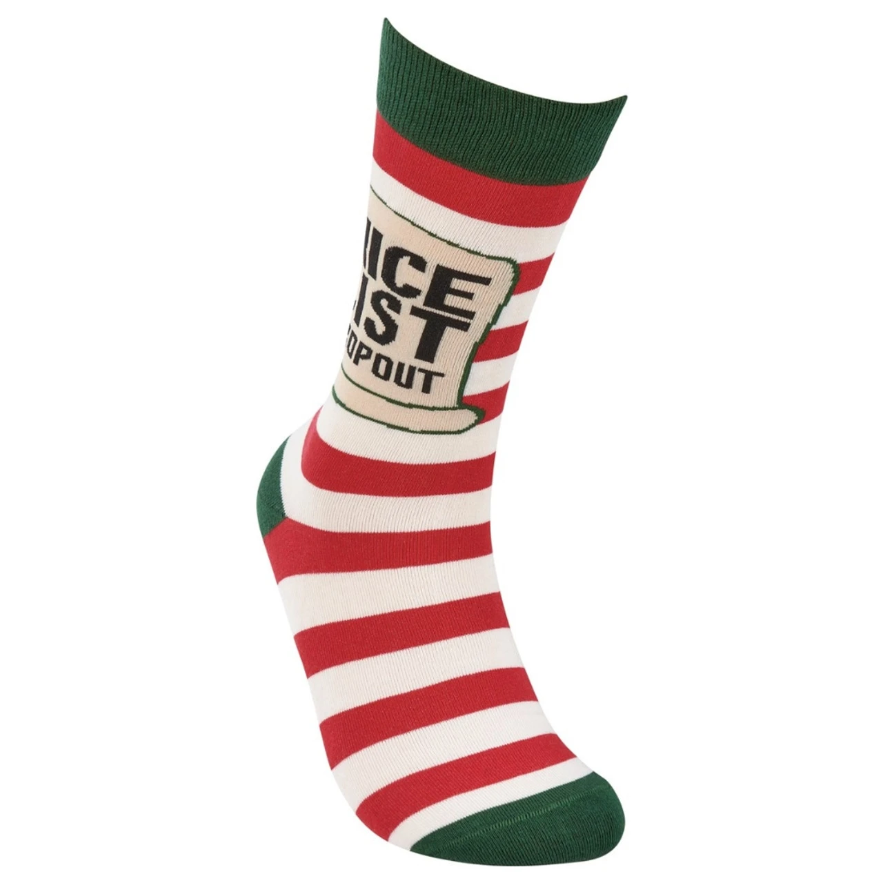 Embrace the holiday spirit with a cheeky twist in our Nice List Dropout socks. These vibrant, cotton-blend socks feature a quirky paper list design set against classic red and white stripes, offering a playful nod for those with a mischievous side. With a comfortable stretch fit catering to most sizes, they make the ideal seasonal statement or a humorous gift for the festive rebel in your life!